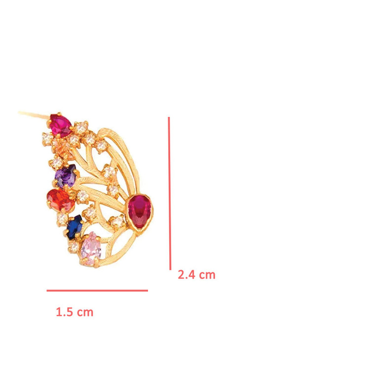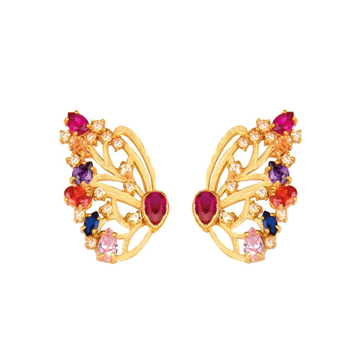 گوشواره طلا زنانه طرح پروانه با نگین های مولتی کار کد ke036 شاهکاری است خیره کننده از برند کاپانی. این گوشواره زیبا از طلا 18 عیار خالص ساخته شده که دارای نگین هایی از طیف گسترده ای از رنگ ها (مولتی کالر) میباشد. نگین های آن شامل سنگهای قرمز گارنت، و سورمه ای یاقوت کبود بوده که زیبایی چشم نوازی به آن داده است. وزن طلا بدون وزن سنگ محاسبه شده است.