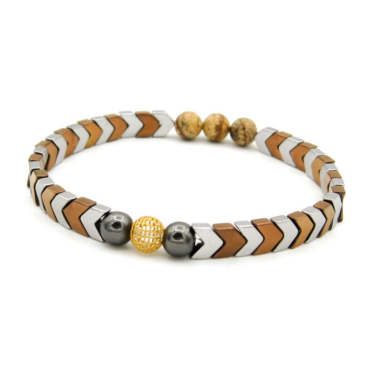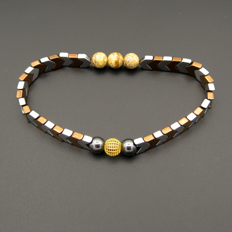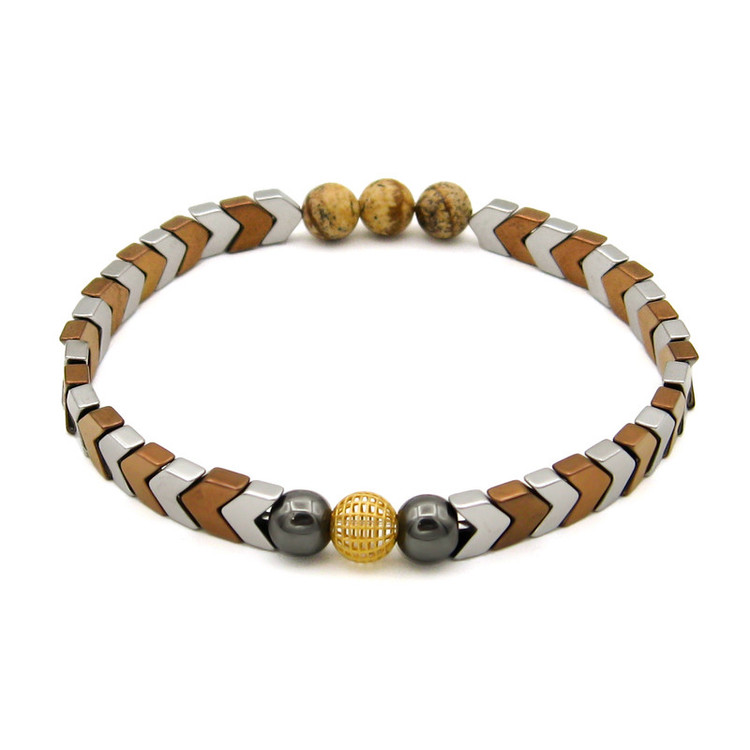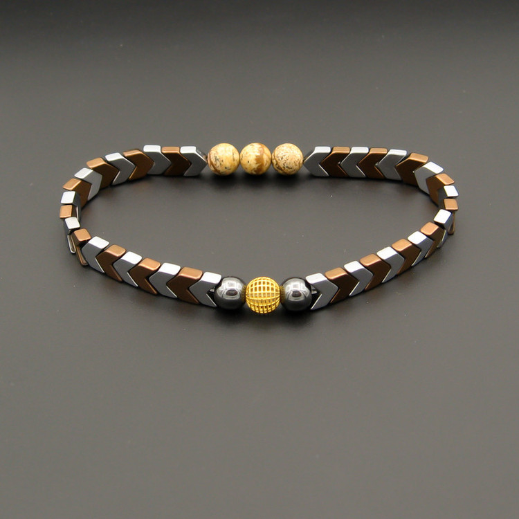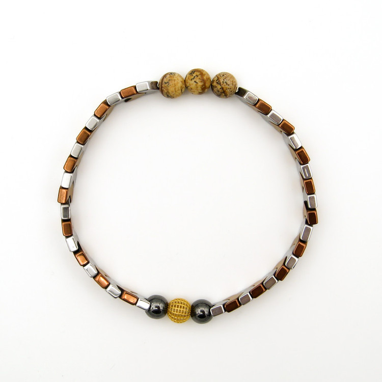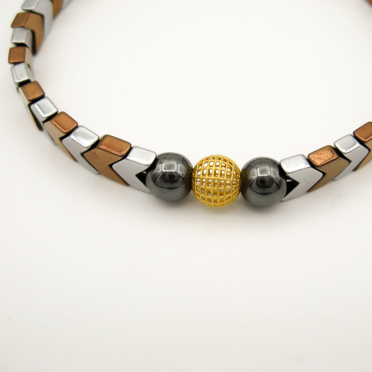 یک گوی طلا 18 عیار به شکل فیوژن به قطر حدودی 0.6 سانتی متر ( 6 میلییمتر ) در مرکز دستبند / به همراه مهره های سنگ طبیعی حدید (هماتیت) به رنگ نقره ای و مسی ، مهره های سنگ جاسپر / دستبند کشی و فری سایز (مناسب تمام سایزها)
