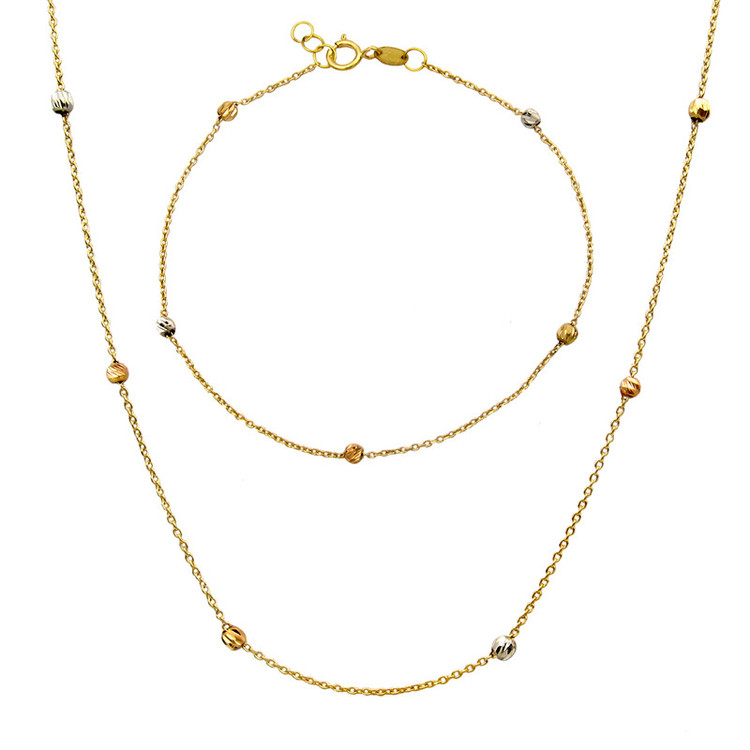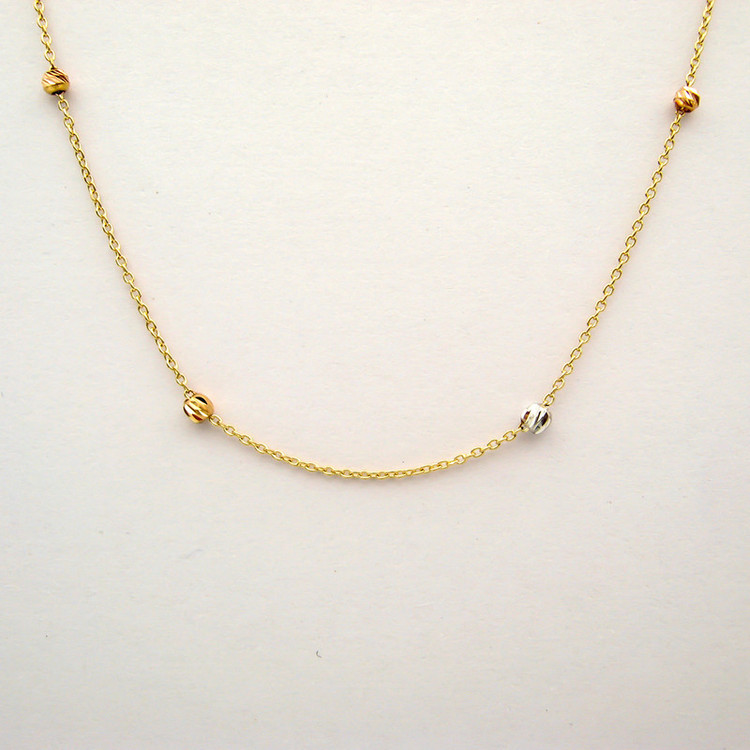 دارای گوی های طلا البرنادو به رنگ های مختلف با ابعاد حدودی 0.3 × 0.3 سانتیمتر طول حدودی زنجیر 18 سانتیمتر