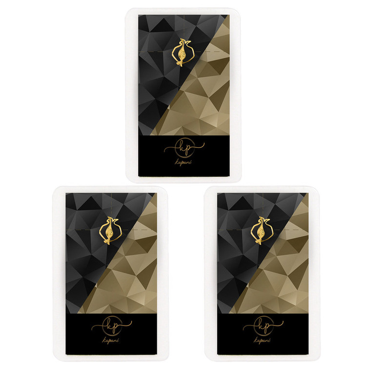 پکیج 3 عددی پلاک طلای 18 عیار طرح انار / ابعاد حدودی پلاک طلا 18 عیار 1.4 × 1.5 سانتیمتر / ابعاد حدودی کارت 9 × 6 سانتیمتر / درج وزن دقیق و عیار طلا 750 در پشت کارت / دارای بسته بندی اختصاصی برند کاپانی / مناسب برای هدیه