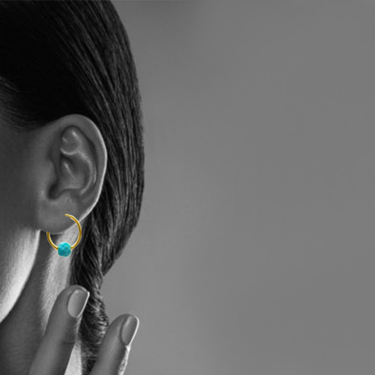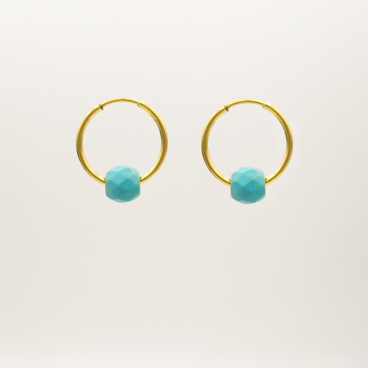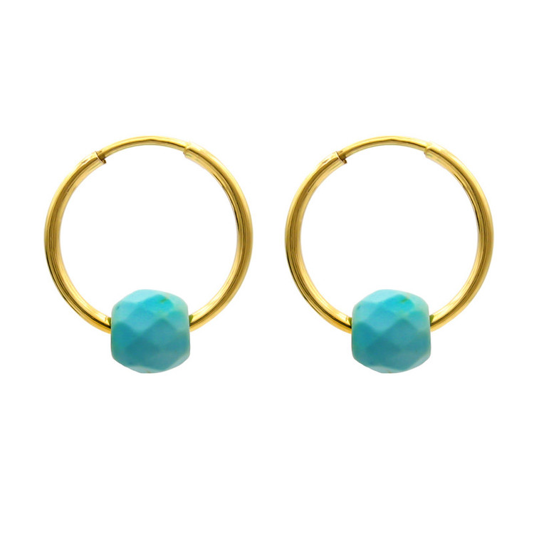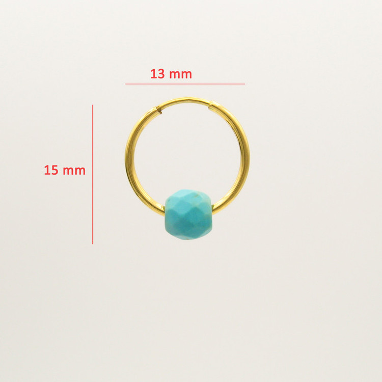 گوشواره طلا 18 عیار حلقه ای به همراه مهره های فیروزه تراش خورده 6 میلی متری با ابعاد حدودی 1.3 × 1.5 سانتیمتر