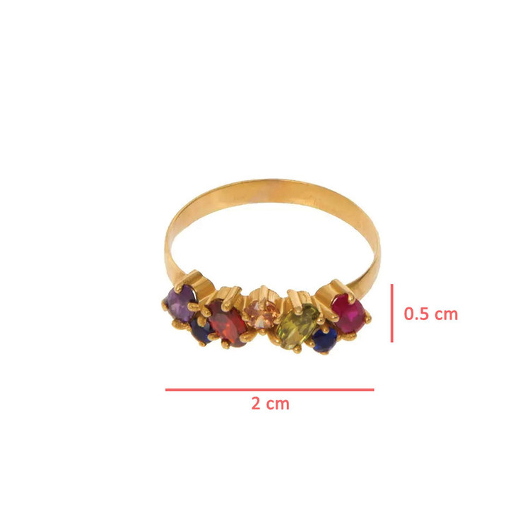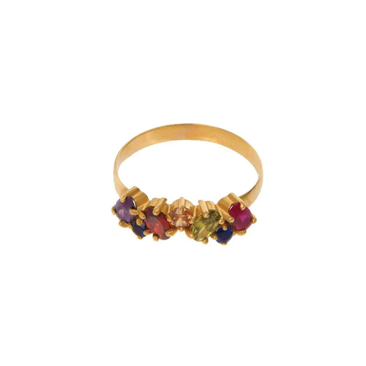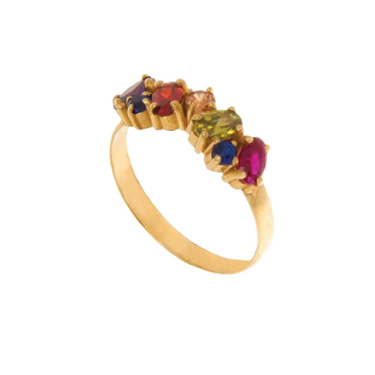 انگشتر طلا زنانه با نگین های مولتی کار شاهکاری است خیره کننده ، این انگشتر زیبا از طلا 18 عیار خالص ساخته شده که دارای نگین هایی از طیف گسترده ای از رنگ ها (مولتی کالر) میباشد. نگین های آن شامل سنگهای قرمز گارنت، و سورمه ای یاقوت کبود و سبز سیترین هست که زیبایی چشم نوازی به آن داده است.