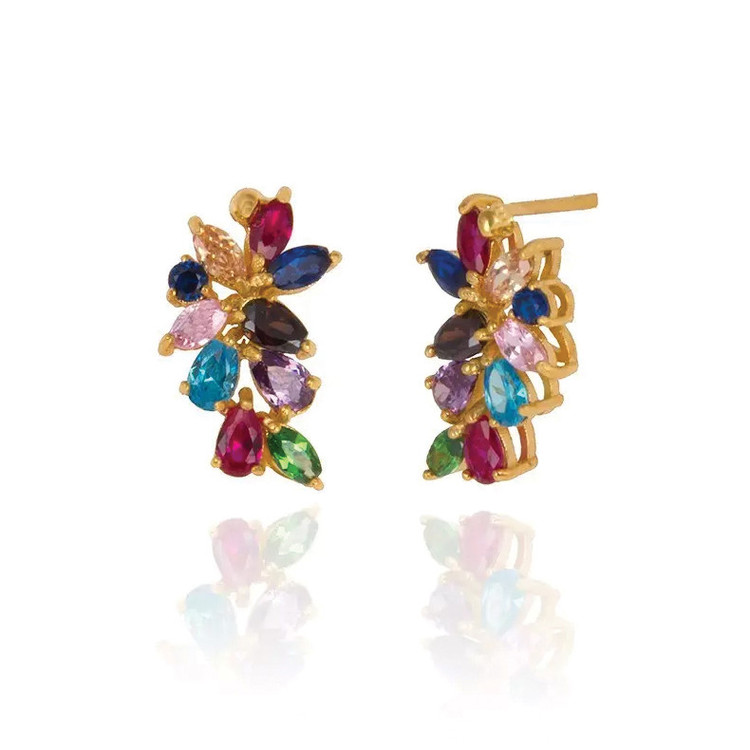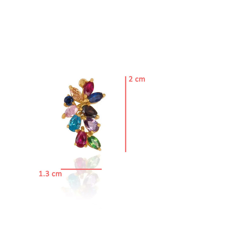شامل نگین هایی از نوع کوبیک زیر کونیا (cz) و رنگ های زیبا (مولتی کالر) / نگین های بکار رفته در گوشواره : گارنت قرمز، سورمه ای یاقوت کبود، سبز سیترین / وزن حدودی نگین ها: 0.96 گرم / وزن طلا بدون وزن سنگ محاسبه شده است.