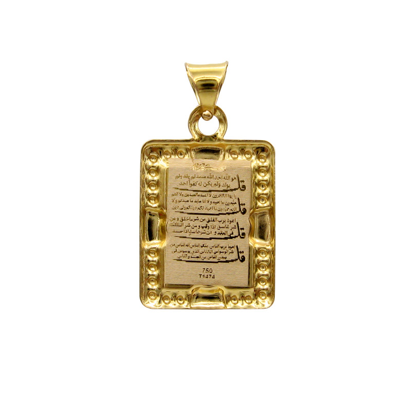 پلاک طلا 18 عیار دو رو به شکل مستطیل / جلوی پلاک سوره و ان یکاد و پشت پلاک چهار قل / ابعاد حدودی پلاک 2.3 × 1.5 سانتیمتر می باشد.
