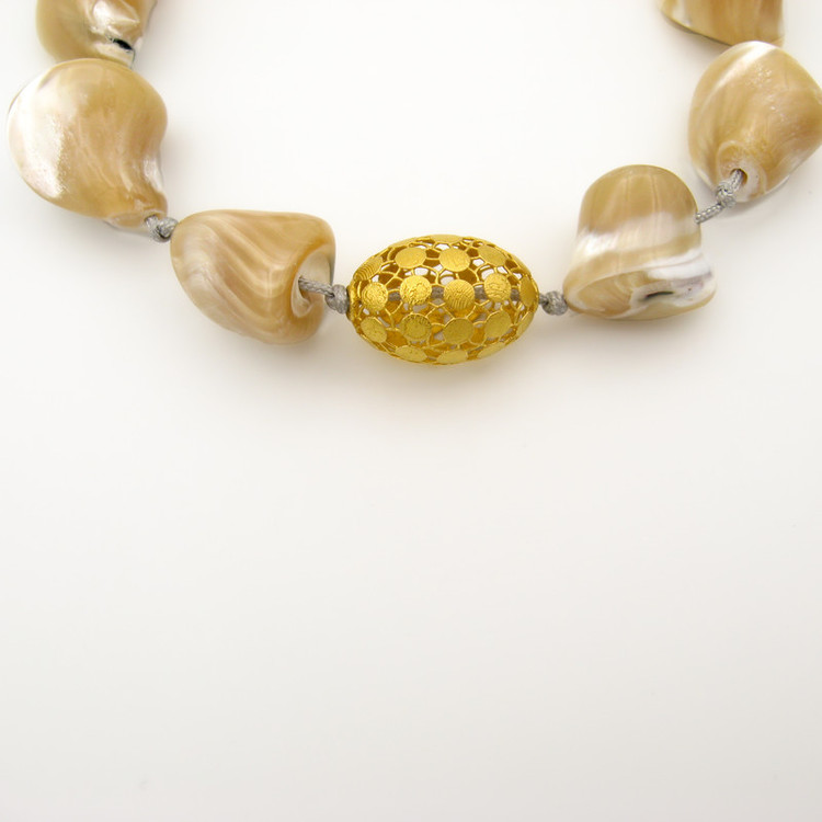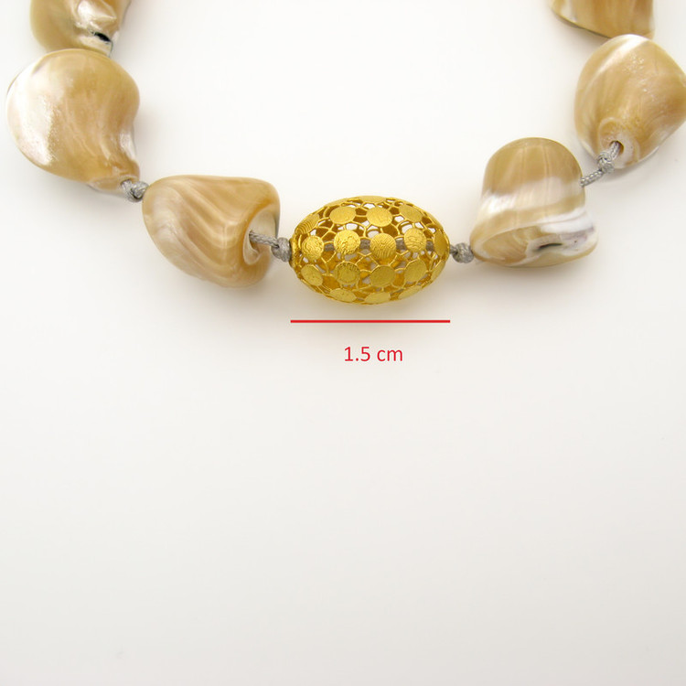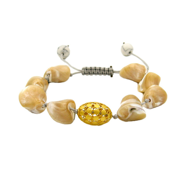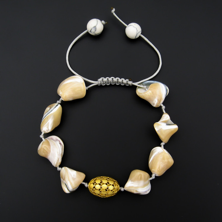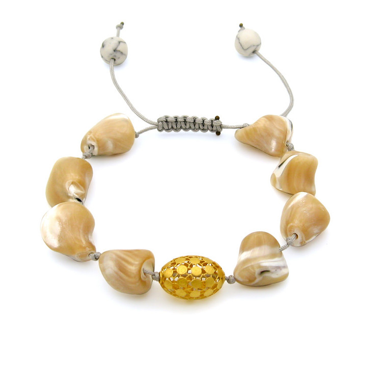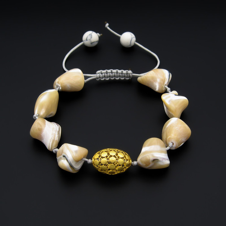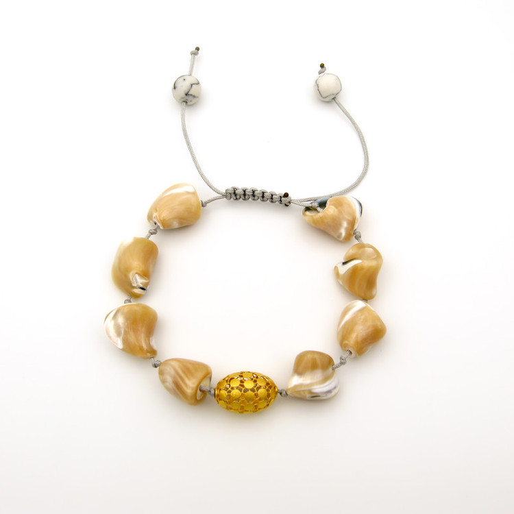 ساخته شده از: پلاک طلا 18 عیار به شکل فیوژن بیضی به ابعاد حدودی 1.5 × 1 سانتیمتر / به همراه مهره های طبیعی صدفی به اشکال نامنظم / به همراه قفل گره ای کشویی با قابلیت فری سایز ( مناسب تمام سایزها ) / این دستبند قابل شستشو میباشد.