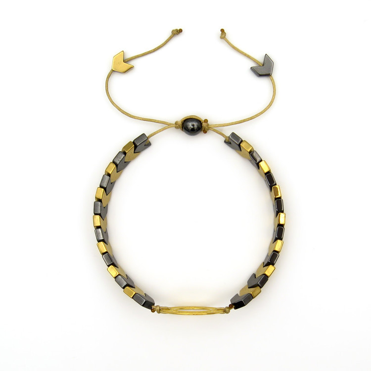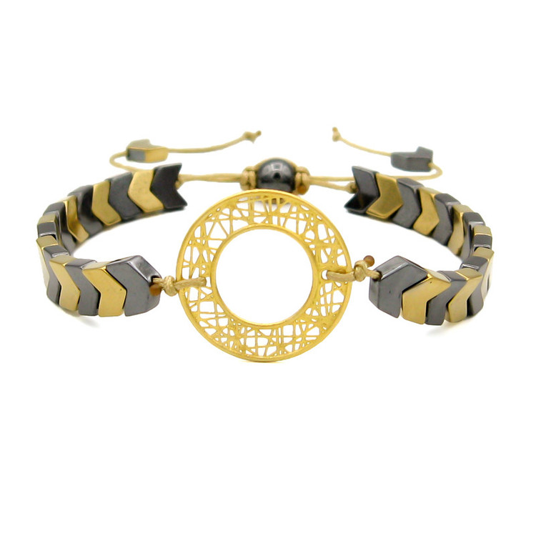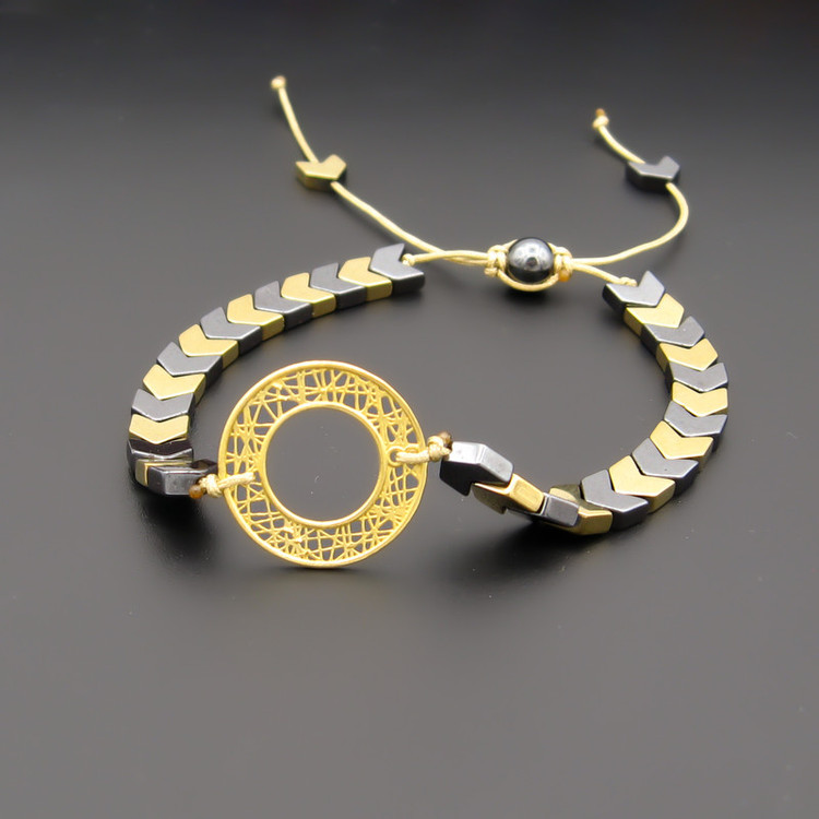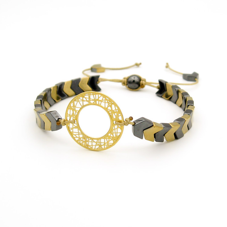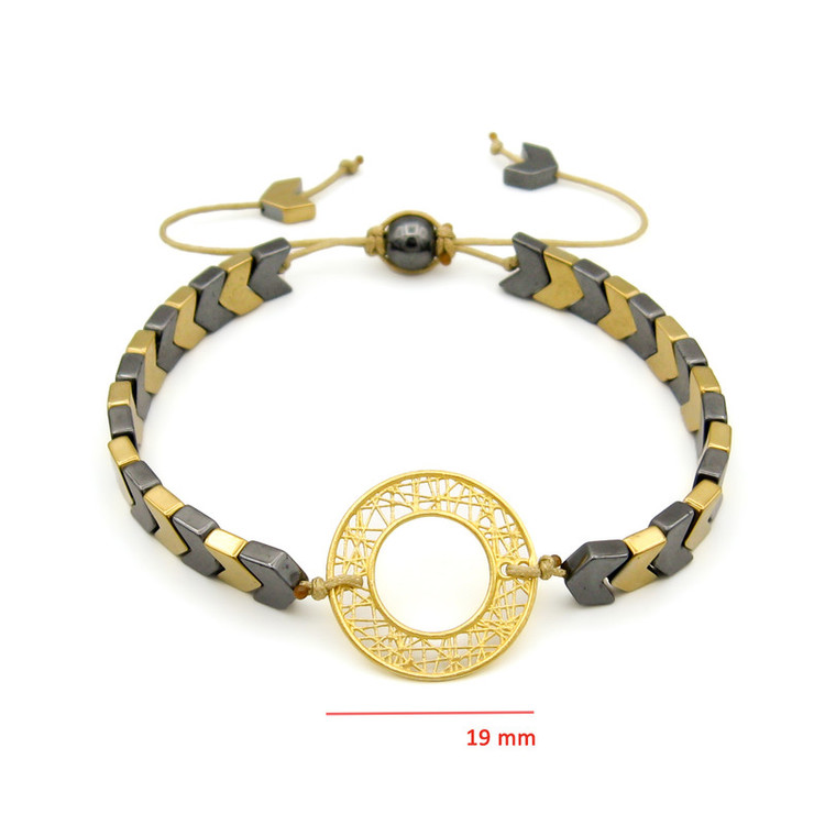 پلاک طلا 18 عیار به گرد و توری به قطر حدودی 1.9 سانتیمتر، به همراه مهره های سنگی حدید در دو رنگ خاکستری و زرد و قفل گره ای کشویی با قابلیت فری سایز ( مناسب تمام سایزها ) / این دستبند قابل شستشو میباشد.