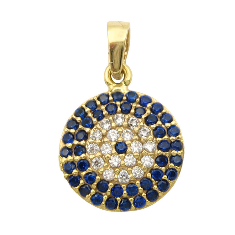 پلاک طلا 18 عیار طرح چشم نظر نگین دار با ابعاد حدودی 1.9 × 1.2 سانتیمتر قرار گیری نگین ها بصورت مخراج کاری دارای نگین های اتمی میکرو با تراش برلیان به رنگ سفید و نگین های طرح یاقوت به رنگ آبی