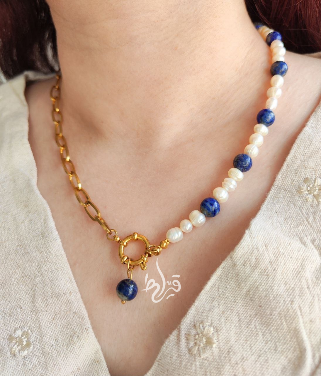 گردنبند زنانه سنگ طبیعی لاجورد و مروارید طبیعی اصل با زنجیر استیل قیراط98 انتخاب فوق العاده زیبا و اقتصادی برای هدیه به عزیزانتان.همچنین این محصول قابل سفارش با متریال های طلا و نقره هست.