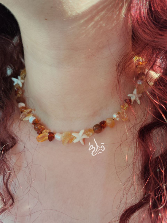 گردنبند با سنگ های کهربا و سیترین و دلربا و مروارید قیراط98 انتخاب عالی برای هدیه به عزیزانتان.همچنین قابل سفارش با متریال های طلا و نقره