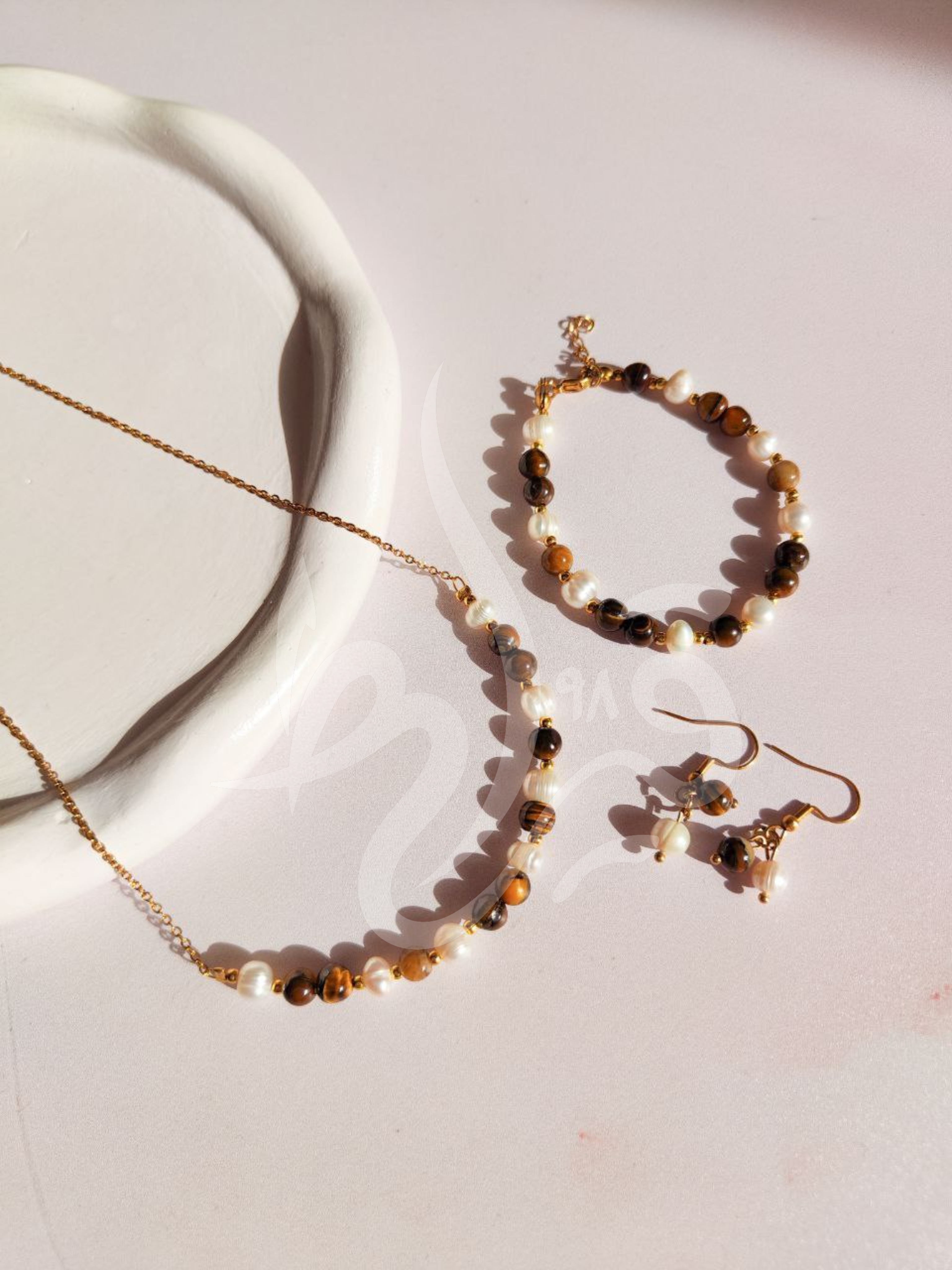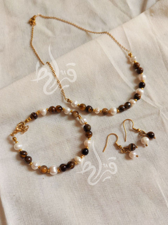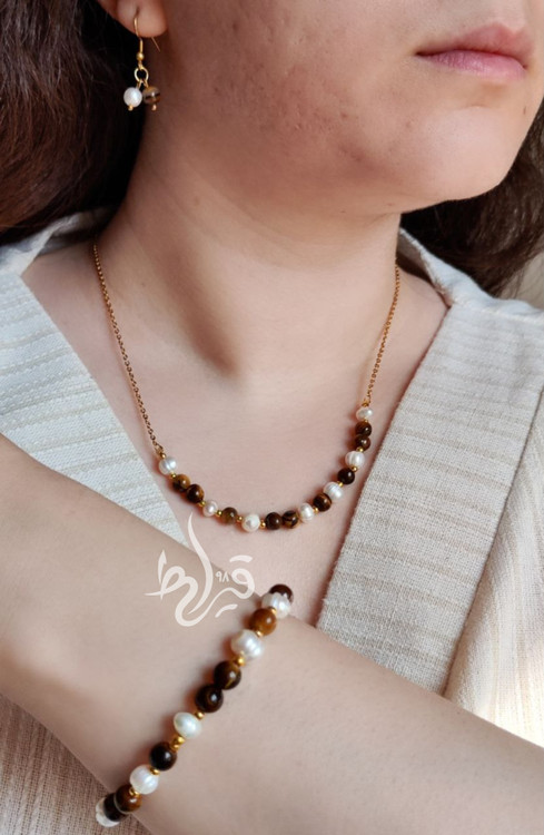 نیم ست زنانه سنگ طبیعی چشم ببر و مروارید پرورشی اصل ساخت قیراط98