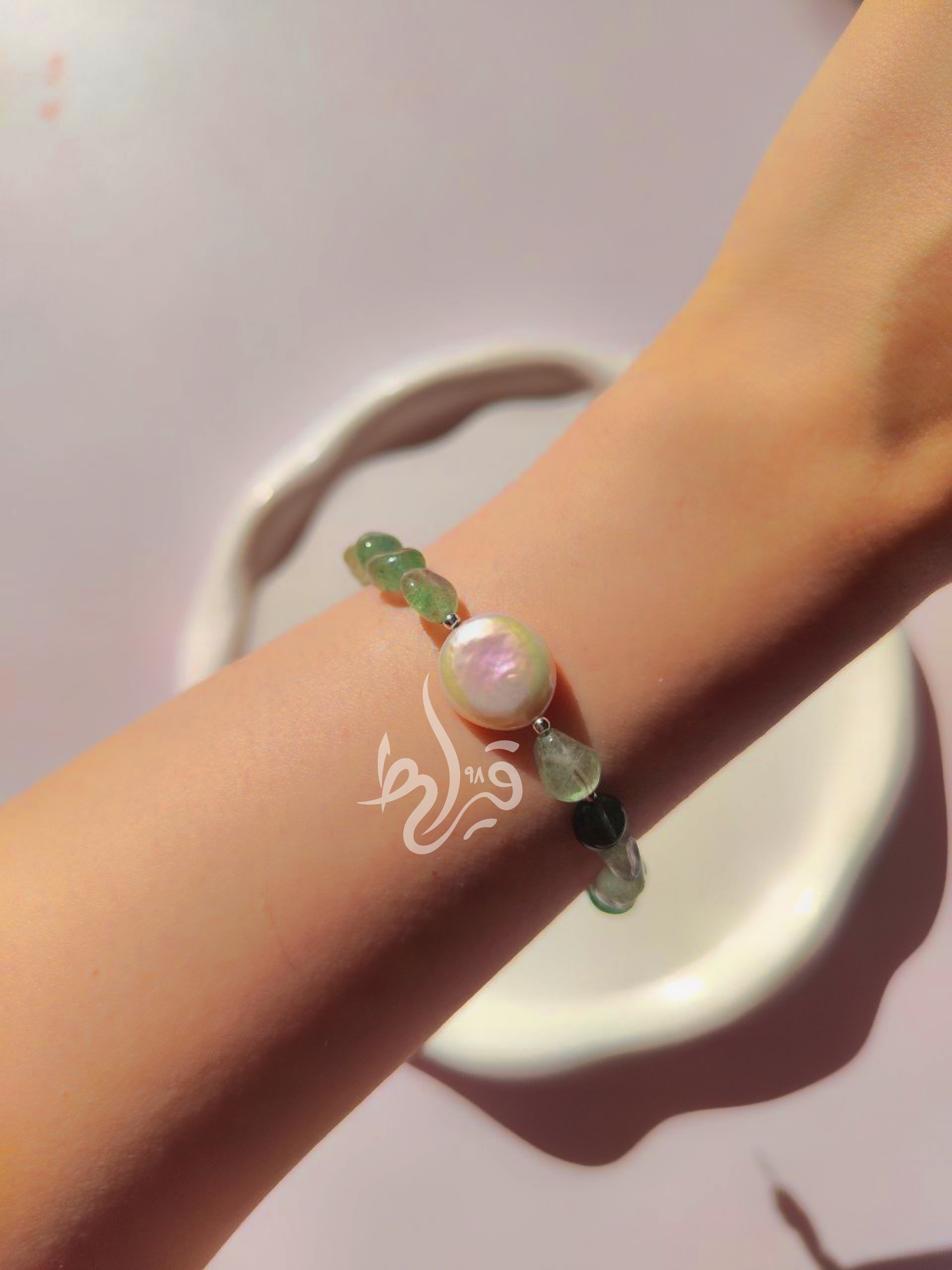 دستبند زنانه سنگ تامبلی اونتورین و مروارید طبیعی دستساز قیراط98