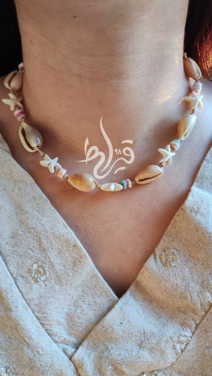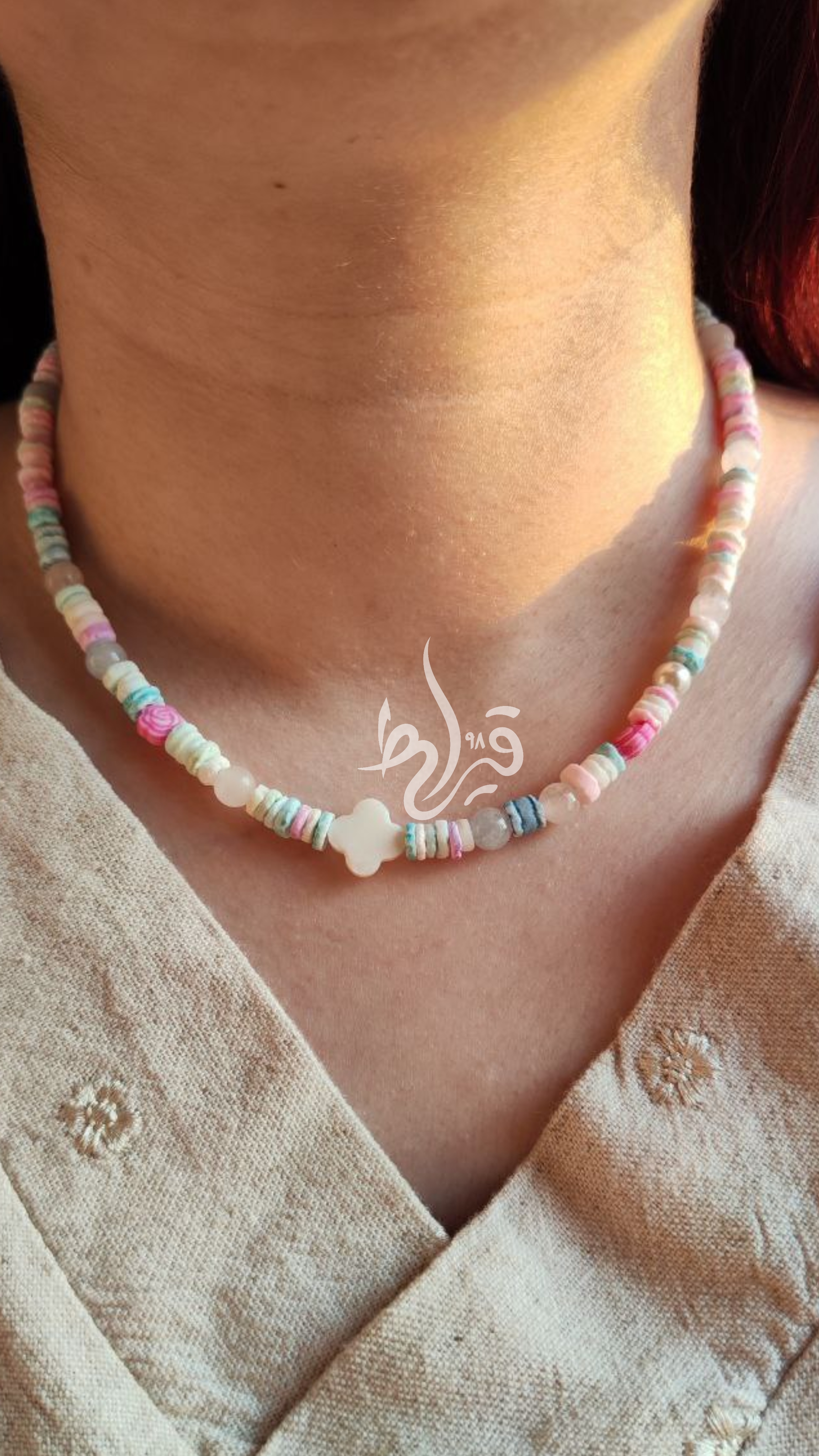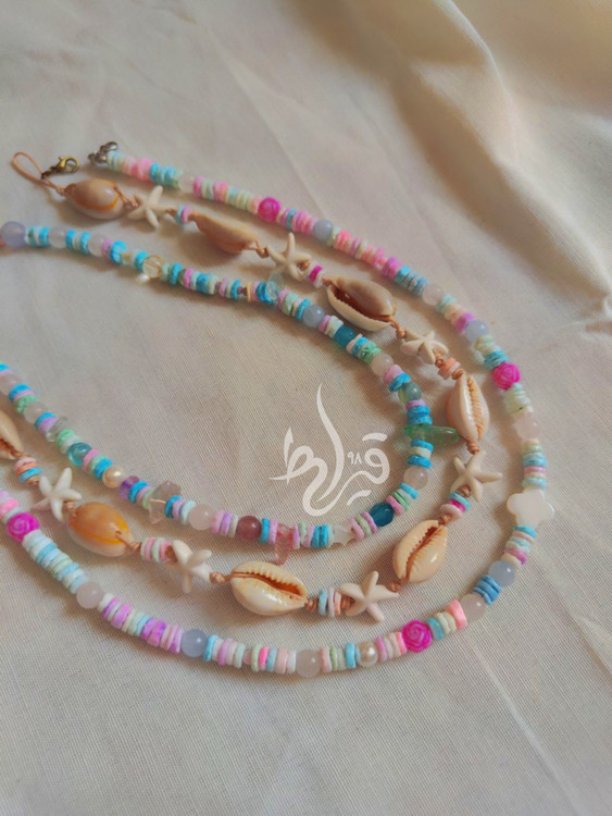 گردنبند های زنانه صدف طبیعی سیپرا واشری رنگی ترکیب شده با سنگ های طبیعی اکوامارین و رزکوارتز قیراط98