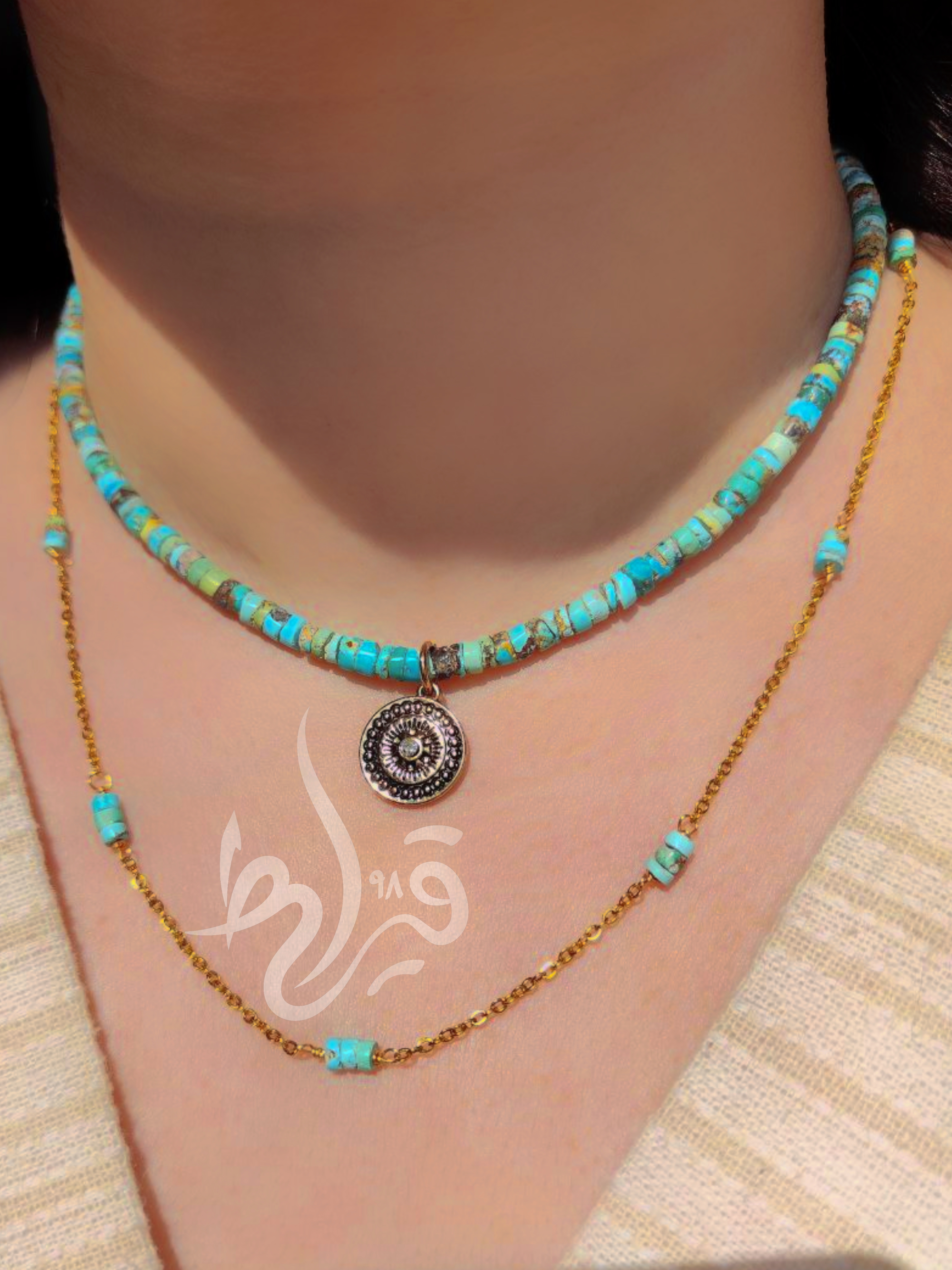 گردنبند زنانه سنگ طبیعی و اصل فیروزه نیشابور تراش واشری قیراط98