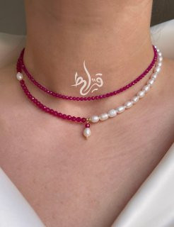 گردنبند دولاین زنانه ودخترانه یاقوت سرخ طبیعی و مروارید طبیعی