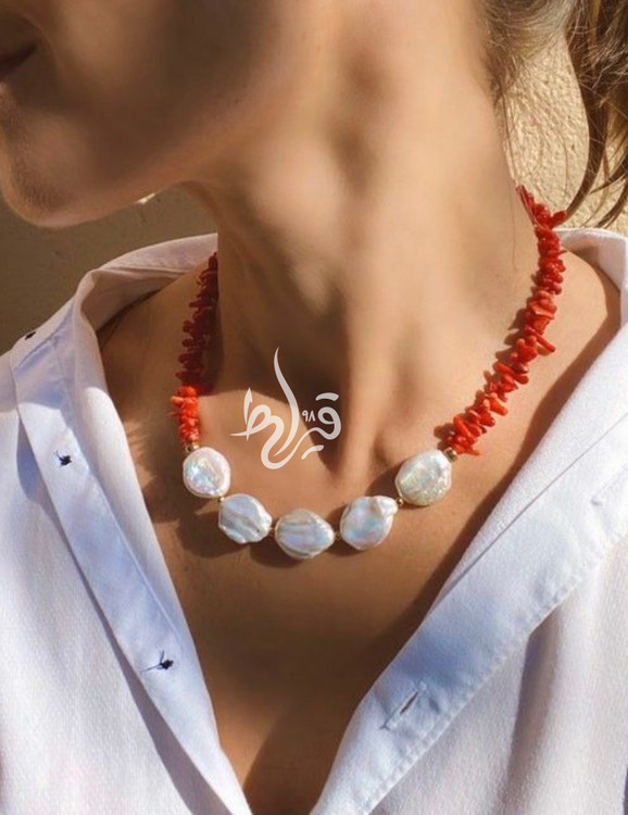 گردنبند زنانه سنگ مرجان طبیعی و مروارید طبیعی باروک سکه ای
