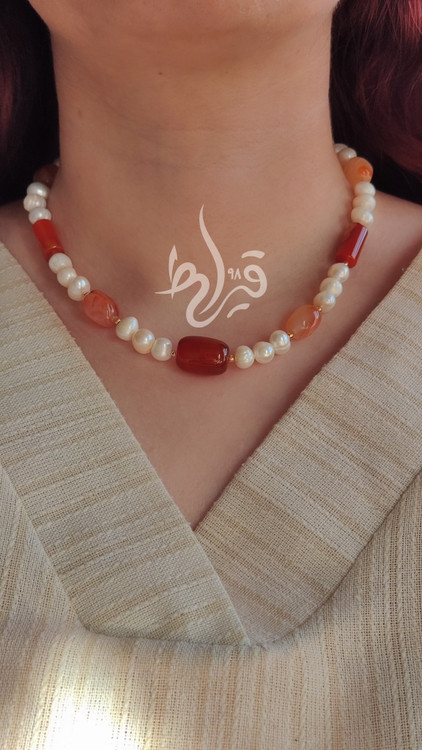 ست گردنبند و دستبند مروارید و عقیق سرخ طبیعی قیراط۹۸