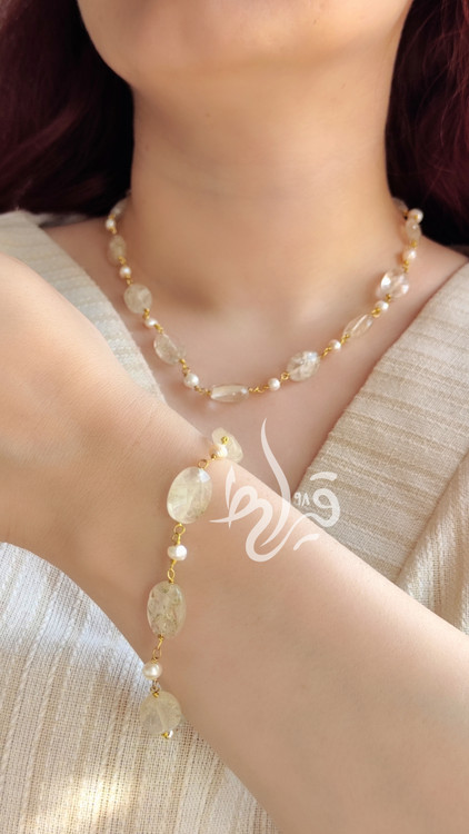ست زنانه دستبند و گردنبند سنگ طبیعی کوارتز و مروارید طبیعی قیراط۹۸