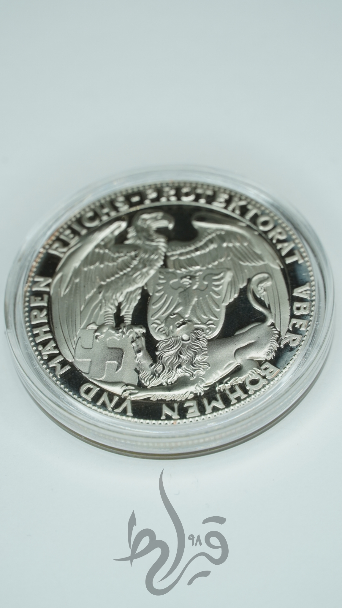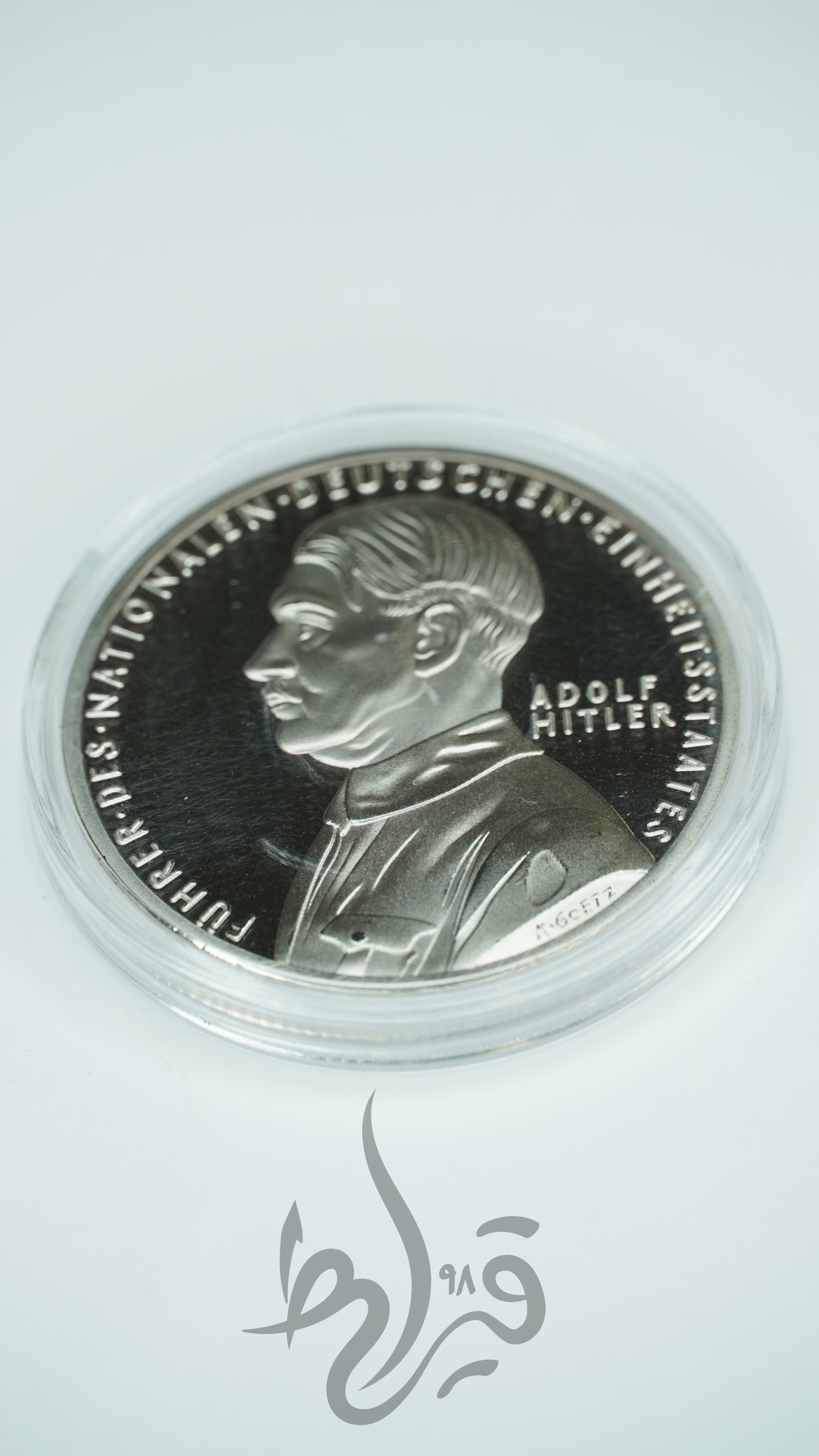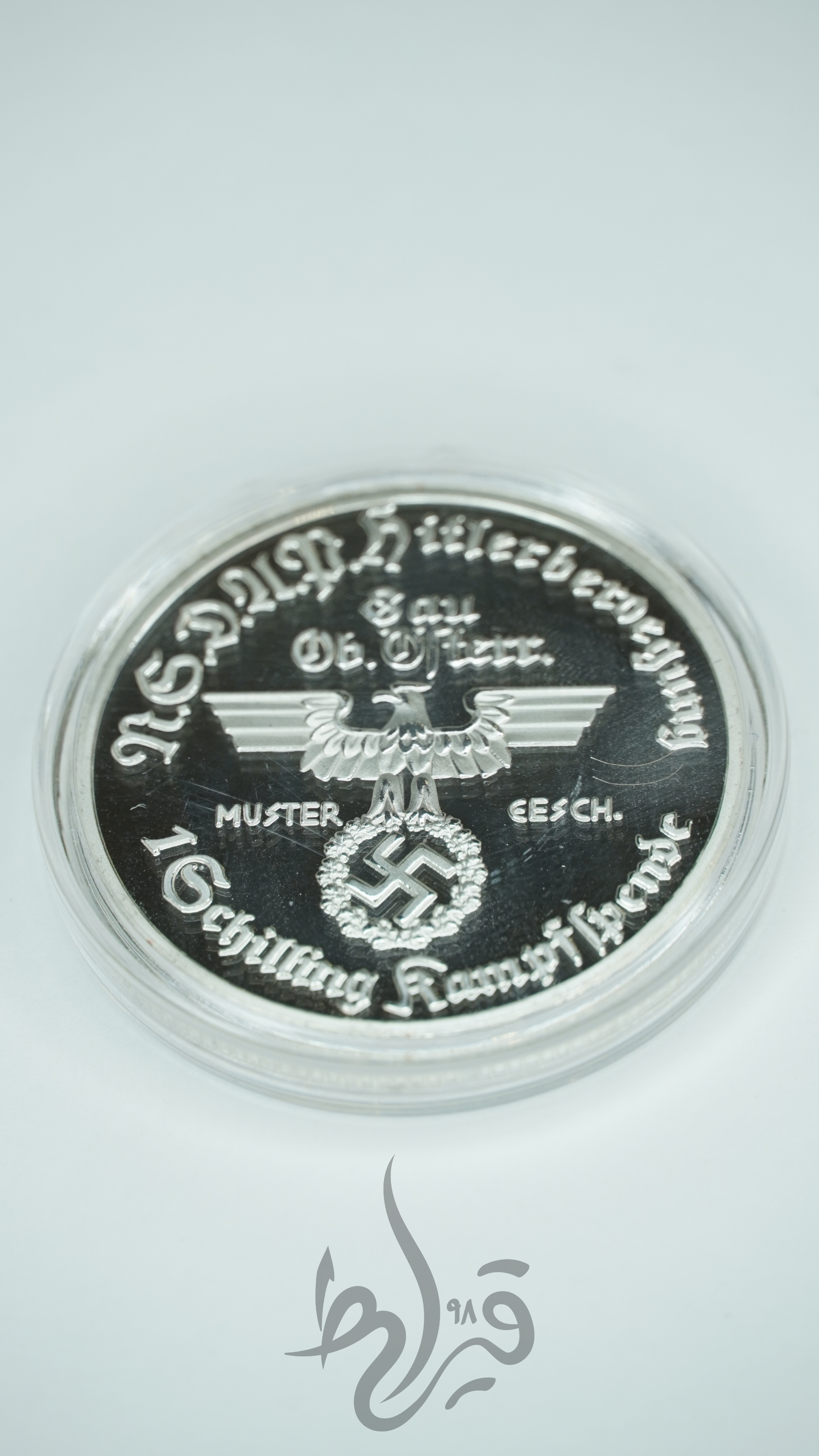 این سکه یک نمونه بازتولید شدهی یادبود تاریخی است که طرحی از چهره و نوشتههای دورهی جنگ جهانی دوم روی آن حک شده است. وجود نمادها و چهرههای آن صرفاً جنبهی شناخت تاریخ دارند. این نوع اقلام معمولاً توسط مجموعهداران برای مطالعه و نگهداری قطعات تاریخی مورد توجه قرار میگیرند.