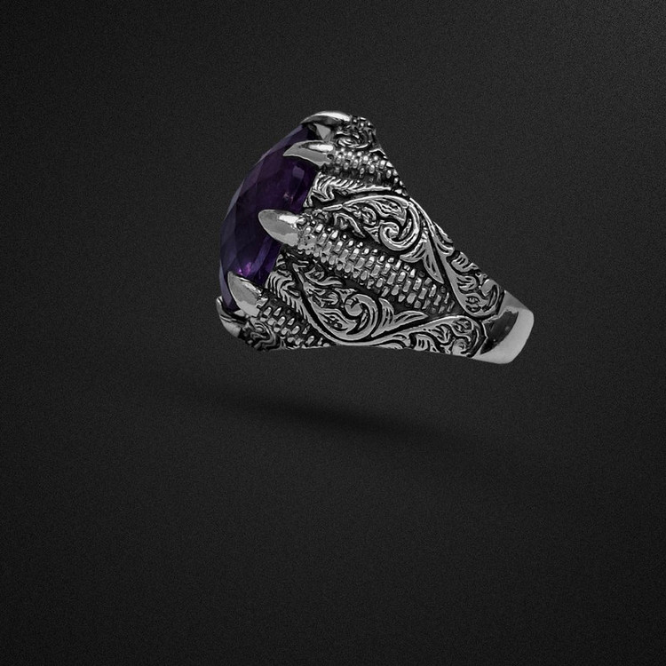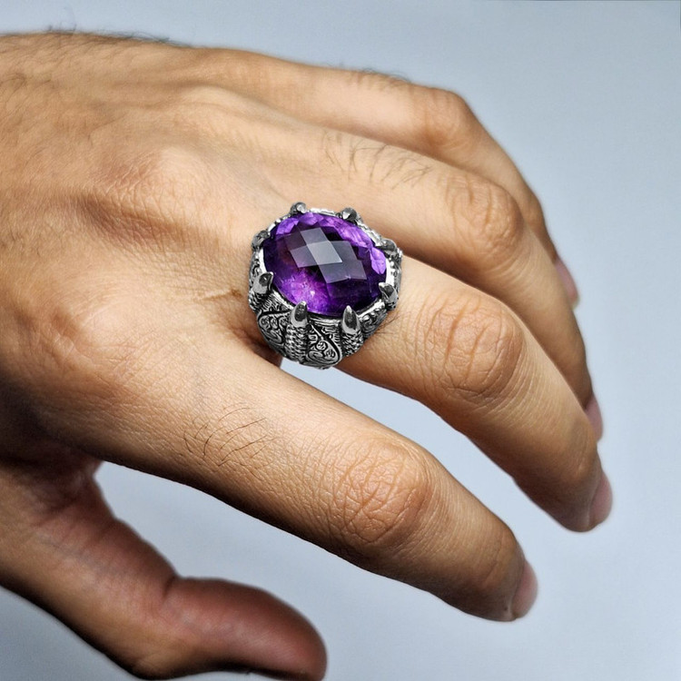انگشتر نقره مردانه 925 سنگ آمیتیست مدل چنگال اژدها تراش فنسی کد 2303
