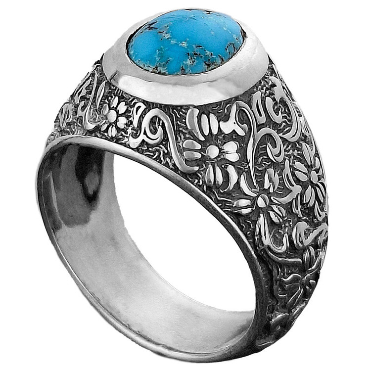 انگشتر نقره مردانه 925 سنگ فیروزه نیشابور مدل رکاب گل اسلیمی کد 9903