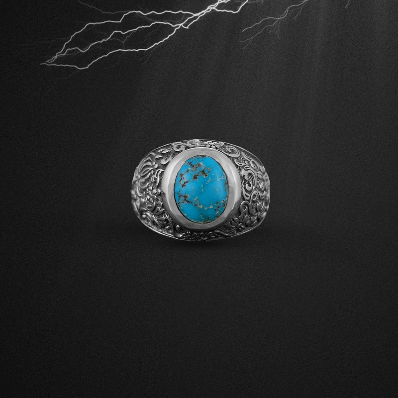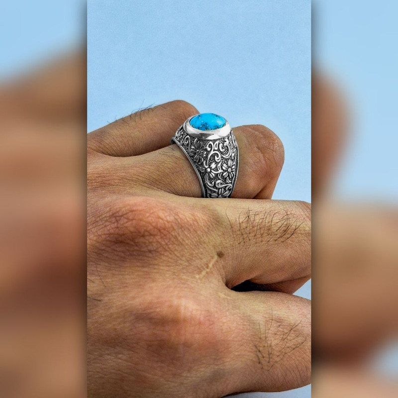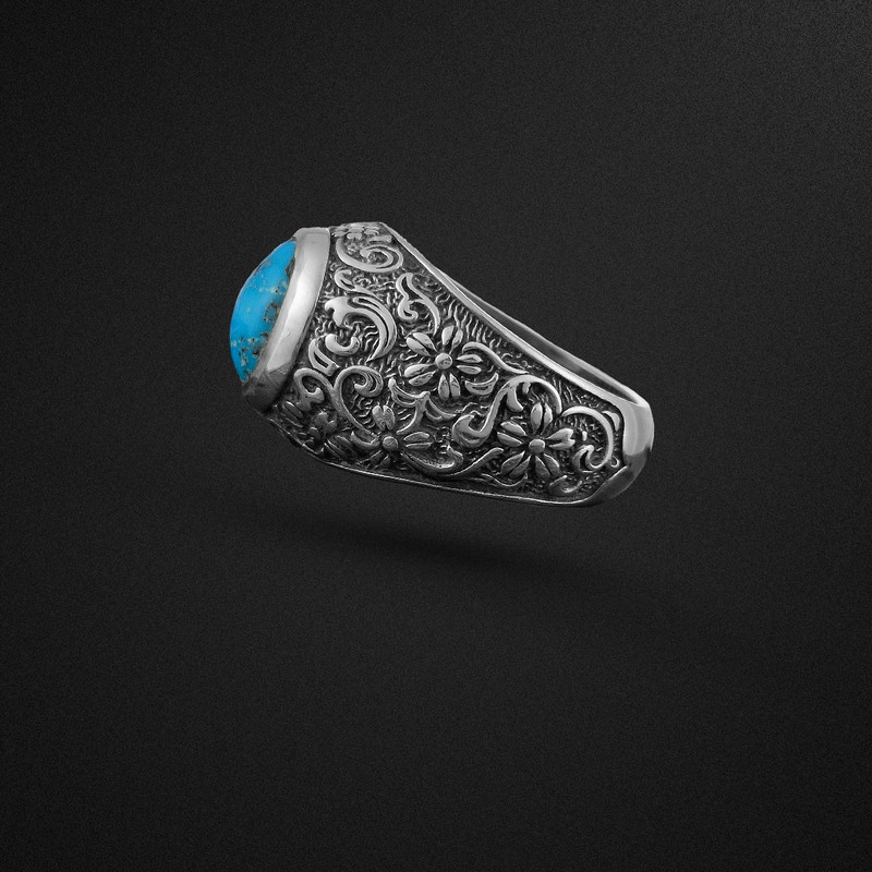 انگشتر نقره مردانه 925 سنگ فیروزه نیشابور مدل رکاب گل اسلیمی کد 9903