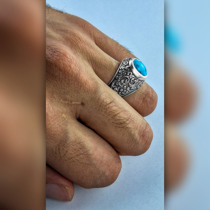 انگشتر نقره مردانه با نگین فیروزه نیشابور انگشتر مردانه واقعا شیک با طرح رکاب خاص و پر جزئیات گل های اسلیمی و نگینِ خوش رنگ فیروزه گوهر به کار رفته در این انگشتر کاملا طبیعی و معدنی میباشد. جنس رکاب از نقره 925 و با نهایت دقت و ظرافت ساخته شده انگشتر به همراه جعبه چوبی فاخر و کارت مشخصات کالا به شما تقدیم میشود. همچنین در مورد سایز انگشتر اصلا نگران نباشید. سایز انگشتر سایز متوسط میباشد و اگر برای انگشت شما بزرگ یا کوچک باشد در نقره فروشی ها، طلافروشی ها، جواهر فروشی ها یا تعمیرات نقره شهرتان با هزینه ناچیزی قابل سایز شدن است.