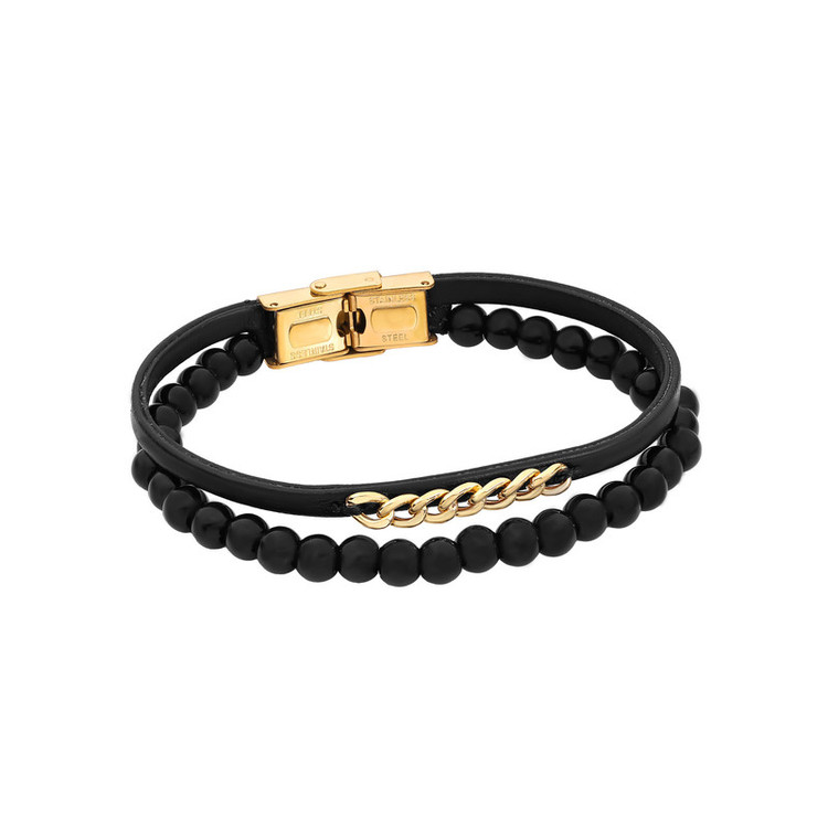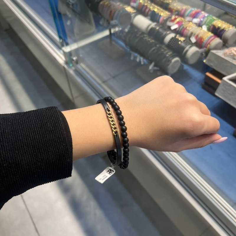 دستبند چرم و مهره مردانه مدل کارتیه مشکی یک ترکیب شیک و امروزی از چرم مشکی، مهرههای مات و زنجیر کارتیه طلایی است که استایلی مردانه، خاص و متفاوت ایجاد میکند. طراحی دو لایهی این دستبند باعث میشود روی مچ جلوهای منظم و خوشفرم داشته باشد و clasp فلزی رنگ طلایی علاوهبر زیبایی، استحکام بالایی دارد و بهراحتی باز نمیشود. این مدل هم برای استفاده روزمره مناسب است و هم در استایلهای نیمهرسمی جلوه بسیار جذابی دارد. بهراحتی میتوانید آن را با ساعتهای مشکی یا طلایی و دستبندهای ساده استیل ست کنید تا یک ترکیب کامل و مدرن بسازید. این دستبند انتخابی عالی برای هدیهدادن به آقایان، مخصوصاً در مناسبتهایی مثل تولد و سالگرد است.