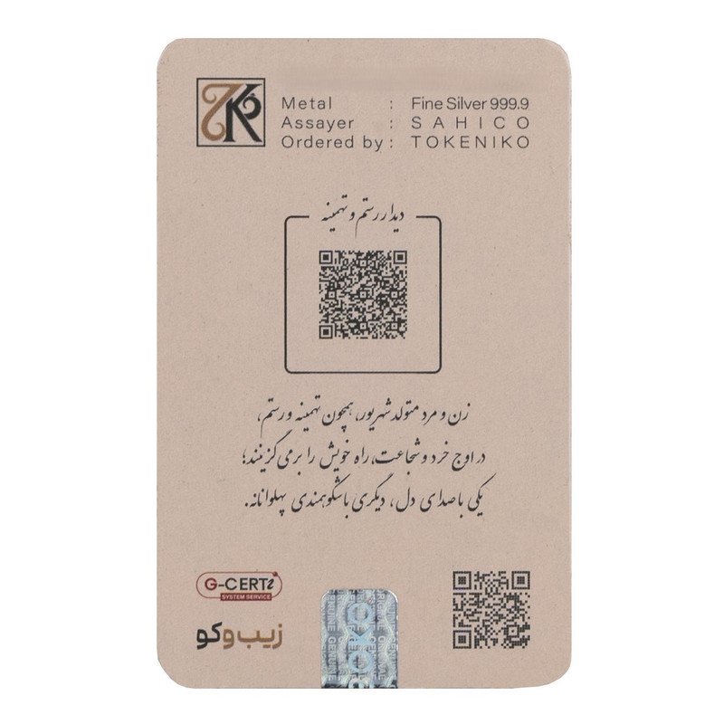 شمش نقره ۱ اونسی زیبوکو طرح «شهریور» (خلوص ۹۹۹.۹) ویژه متولدین ماه شهریور بهترین هدیه تولد و کادوی سازمانی نفیس و پرمعنا است . با نگاره عاشقانه و حماسی «دیدار تهمینه و رستم» از شاهنامه و نماد گندم، نماد خرد، کمالجویی و عنصر خاک که دقیقاً با روحیه دقیق، پاکطلب و عاشق متولدین شهریور همخوانی دارد. پشت بستهبندی شعر کوتاه و QR کد ویدئوی کامل داستان تهمینه و رستم و شماره سریال اختصاصی درج شده است . متن معرفی به ۴ زبان (فارسی، انگلیسی، عربی، روسی) روی بستهبندی چاپ شده؛ انتخابی بسیار شیک و فرهنگی برای هدیه سازمانی به کارمندان، مشتریان، مهمانان خارجی (بهویژه از کشورهای ترکمنستان، تاجیکستان، ازبکستان، ارمنستان و قرقیزستان) و توریستها می باشد . شمش نقره ۱ اونسی زیبوکو طرح شهریور: سرمایهگذاری مطمئن در نقره و هدیهای ماندگار و عمیق برای متولدین ماه ششم سال که با خرد و شجاعت راه کمال را میپیمایند.
