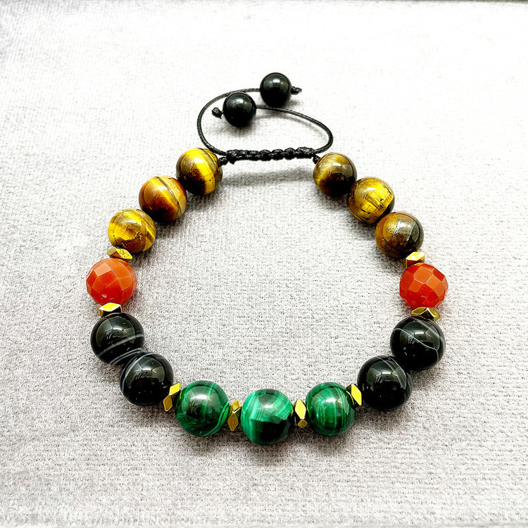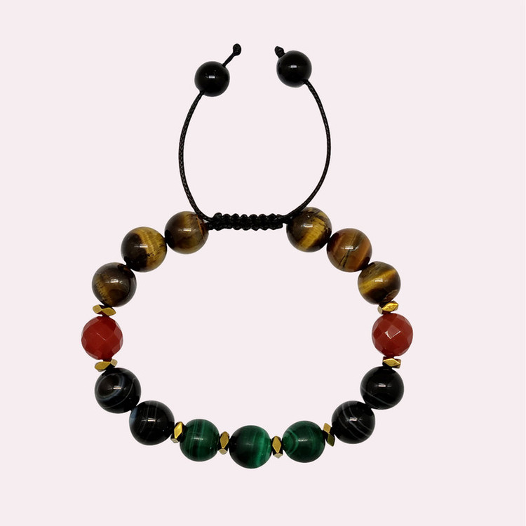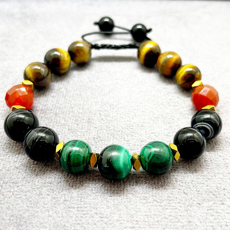 دستبند مردانه میکس سنگهای مالاکیت کنگو و چشم ببر و عقیق ،که تمام سنگها اصل کار شده است.بدلیل اصل بودن سنگها خواص زیادی دارند از جمله خواص مالاکیت:سنگ فوق العاده برای خلاقیت است و نماد آرامش درونی و استقامت و کاهش دهنده درد استخوانها است.سنگ ماه تولد اردیبهشت،مرداد،آبان و آذر و بهمن است و دفع انرژی های منفی و کاهش اضطراب و استرس و تنش و راحتی خواب است.و تقویت قلب و سیستم گردش خون از دیگر خواص مالاکیت است.باعث کاهش فشار خون و ورم مفاصل میشود. چشم ببر نیز سنگ قدرت و ثروت و شجاعت است .و همچنین چشم ببر سنگ ماه خرداد و مرداد و شهریور است.کمک به برطرف کردن مشکلات مالی میکند. عقیق نیز سنگ ملایمت و عشق و مهربانی است.و فوق العاده آرام بخش است