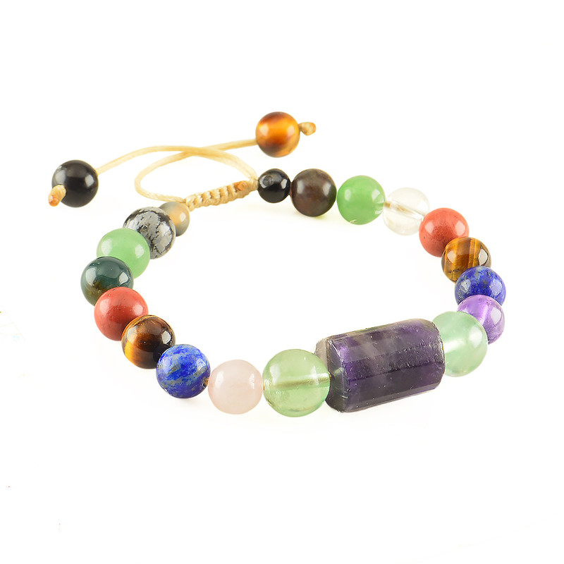 دستبند هفت سنگ چاکرا شامل سنگ های طبیعی آمتیست (تراش استوانه)، فلوریت سبز، لاجورد، چشم ببر، جاسپرسرخ، کریستال کوارتز، رزکوارتز، آونتورین سبز، ابسیدیان لکه برفی، پیترسیت، عقیق سیاه، عقیق خزه و آمتیست میباشد. این دستبند مناسب سایز مچ 17 الی 19 سانت است. تمامی سنگ های دستبند هفت سنگ چاکرا، تماما اصل و طبیعی هستند.