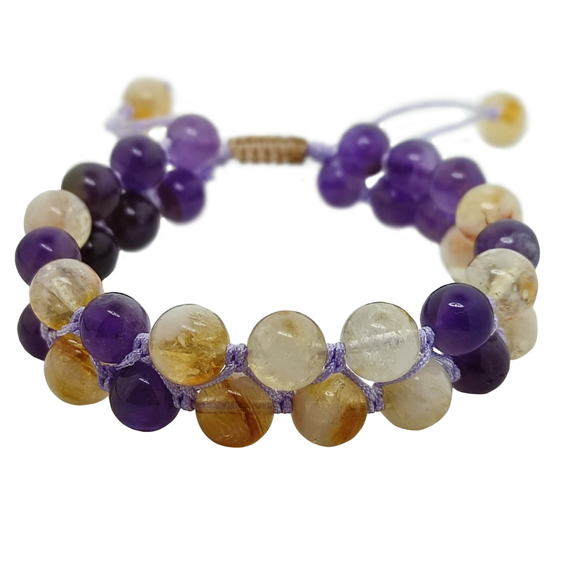 این دستبند ساخته شده از سنگ های کاملا طبیعی و معدنی آمیتیست و سیترین میباشد که در بسته بندی کیسه الیاف طبیعی به همراه کاتالوگ و یک عدد بلور طبیعی آمیتیست ارائه میشود.