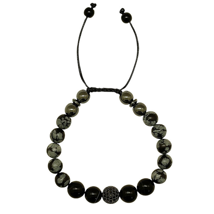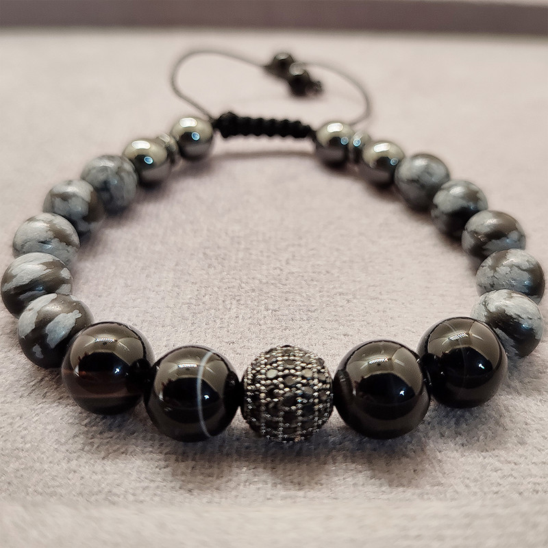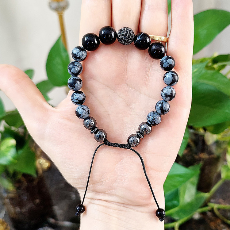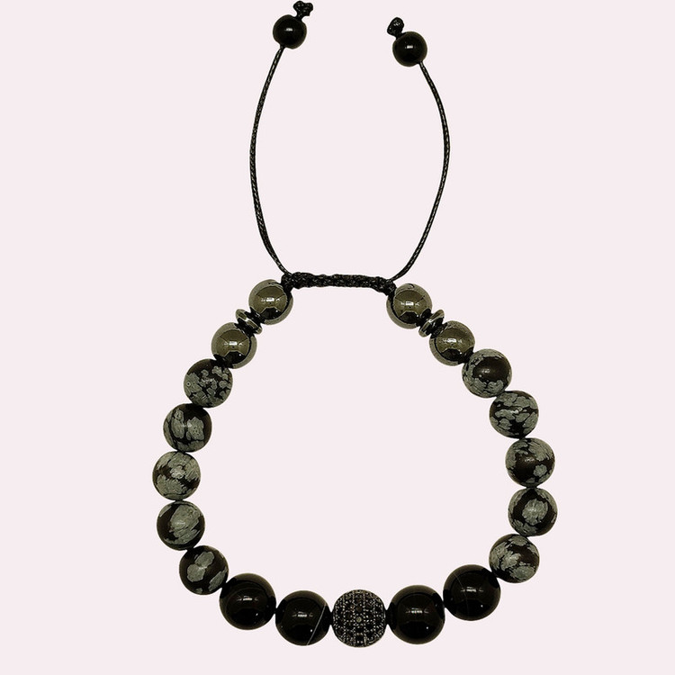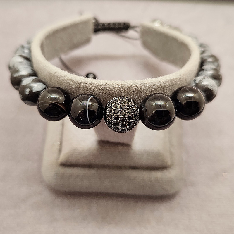 دستبند فوق دارای سنگهای عقیق و آبسدین و گوی حدید و گوی سواروسکی می باشد آبسیدین سنگ ماه تولد شهریور،مهر،آبان،آذر،دی و اسفند است. این سنگ مثل تمام سنگهای سیاه به سیاره زحل تعلق دارد این سنگ تسکین دهنده ی درد های مفصلی و همچنین گرفتگی های عضلانی است. افرادی که می خواهند از انرژی های منفی خلاص شوند این سنگ را زیر پای خود قرار می دهند. اگر کسانی که مشکلات کبدی دارند این سنگ را بر روی کبد خود قرار دهند و به طور متوسط بیست دقیقه صبر کنند کبد را پاکسازی می کند. برای تسکین درد در ناحیه زانو و پا و مفاصل توصیه میشود. باعث تسکین عفونتهاوالتهابات شده و ضد باکتری می باشد. و نیز مانع زخم معده است. و تقویت کننده استخوانهاست. سنگ محافظ و پشتیبان در برابر چشم زخم عقیق: نماد ثبات و پایداری است. در زمانهایی که نیاز به پشتیبانی و حمایت داریم ،عقیق می تواند این احساس را به ما منتقل کند. ایجاد آرامش در انسان در زمان فشارهای روحی بالا و اضطراب. ایجاد حس اتکا به خود و اعتماد به نفس در فرد سنگ عقیق نوعی هماهنگی میان ذهن و روح ایجاد می کندو بر چاکراها تاثیر مثبت دارد. اصالت و خلاقیت را تحریک می کند. برای تصفیه خون و کلیه مفید بوده و انسولین را نیز تنظیم می کند. زایمان را آسان می کند. سنگ عشق و ملایمت و مهربانی برای بیماریهای قلبی،پارکینسون و مشکلات ریه و طحال مفید است. .