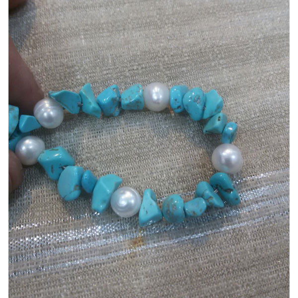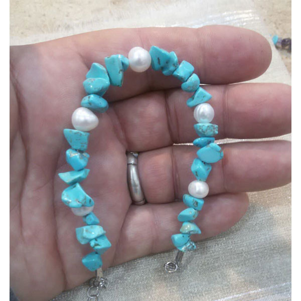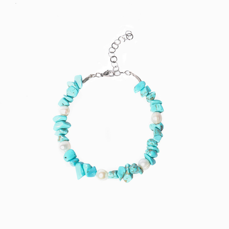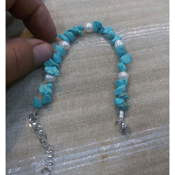 محصولی را که مشاهده می فرمایید دستبند مدل سنگ فیروزه و مروارید می باشد. فیروزه و مروارید به کاررفته کاملا طبیعی می باشند و برای گروههای سنی نوجوانان، جوانان و بزرگسالان مناسب است. سیم به کار رفته جواهری روکشدار کاملا رنگ ثابت و قفل و زنجیر به کار رفته استیل کاملا رنگ ثابت می باشند از لحاظ خواص سنگ فیروزه در کاهش اضطراب و استرس و ایجاد آرامش و دفع زخم چشم بسیار موثر می باشد.