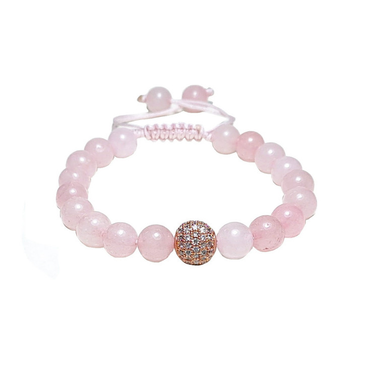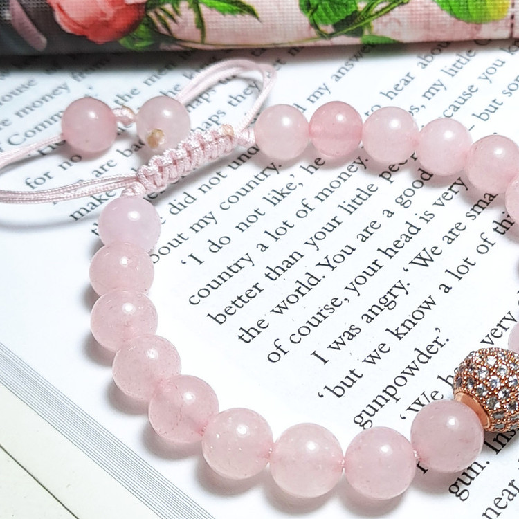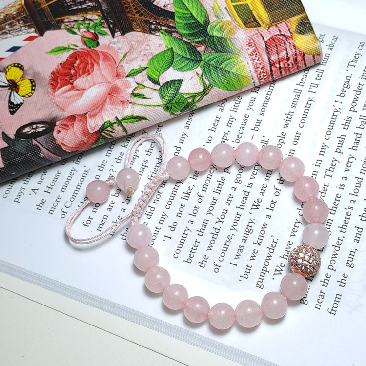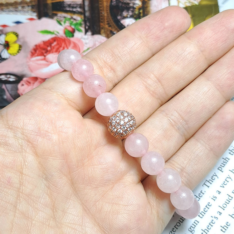 دستبند زنانه از سنگ رزکوارتز صورتی سایز 8 ساخته شده است. خرجکار به کار رفته سوارسکی رنگ ثابت نگین کاری شده است. این دستبند مناسب سایز مچ دست 16 تا 23 سانتی متر است.