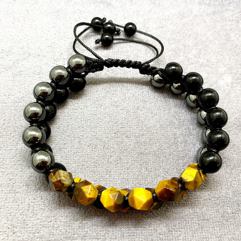 دستبند بافت دو رج ،میکسی از سنگهای چشم ببر و عقیق و گوی حدید می باشد.سنگعا بدلیل اصل بودن خواص زیادی دارد .از جمله خواص چشم ببر جذب قدرت و ثروت است و به سنگ شجاعت معروف است.چشم ببر سوخت و ساز بدن را بالا میبرد و باعث افزایش انرژی در بدن میشود.سنگ چشم ببر به برطرف شدن مشکلات مالی کمک می کند.سنگ حدید ضد استرس و اضطراب بوده و بسیار آرامش بخش است.و باعث ایجاد رونق در کسب و کار میشود.