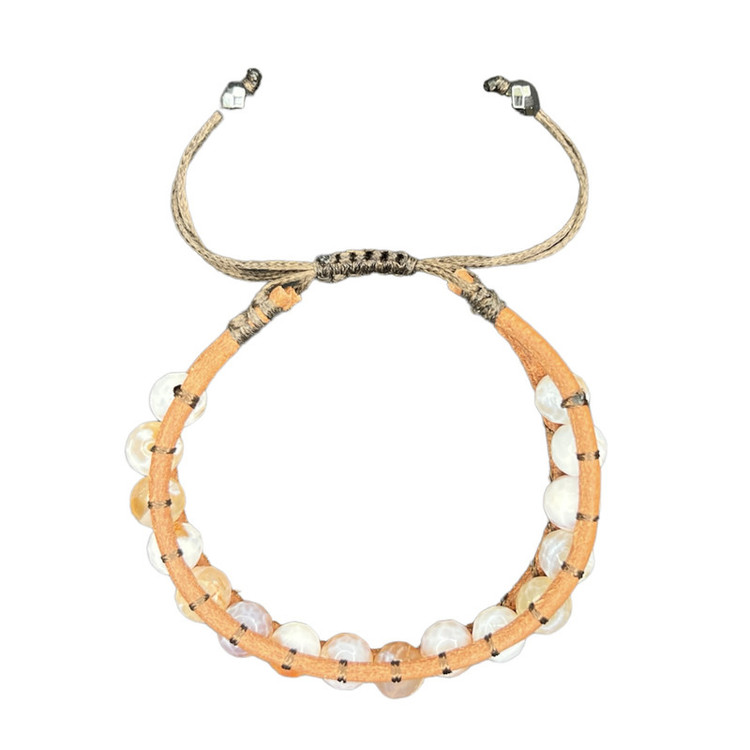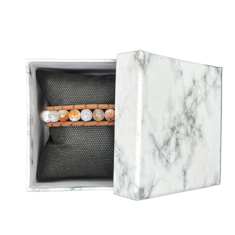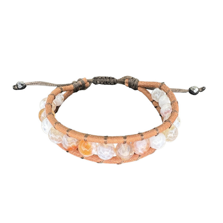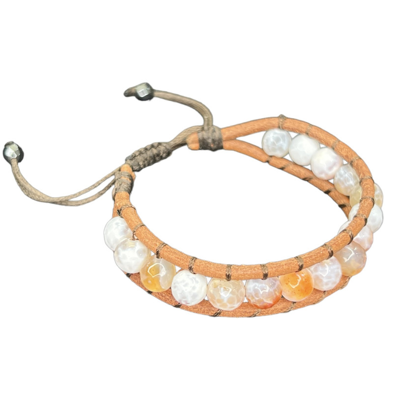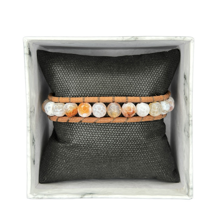 دستبند پسرانه و دخترانه با ترکیب سنگ عقیق تراش دار و چرم سنگ ها وسط دو ردیف چرم بافته شده و اندازه دستبند نسبت به اندازه موچ دست قابل تنظیم میباشد. سنگ ها و چرم به کار برده اصل میباشد.