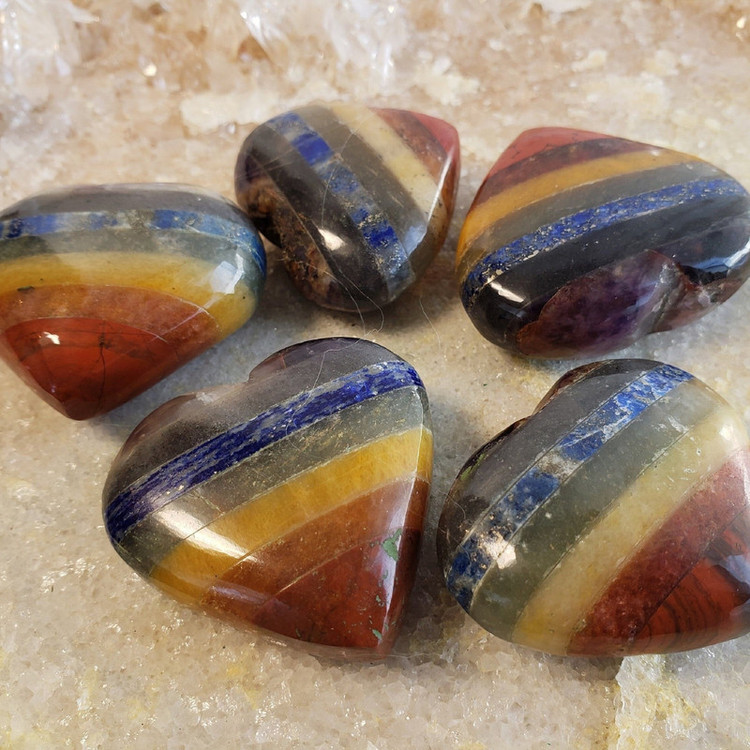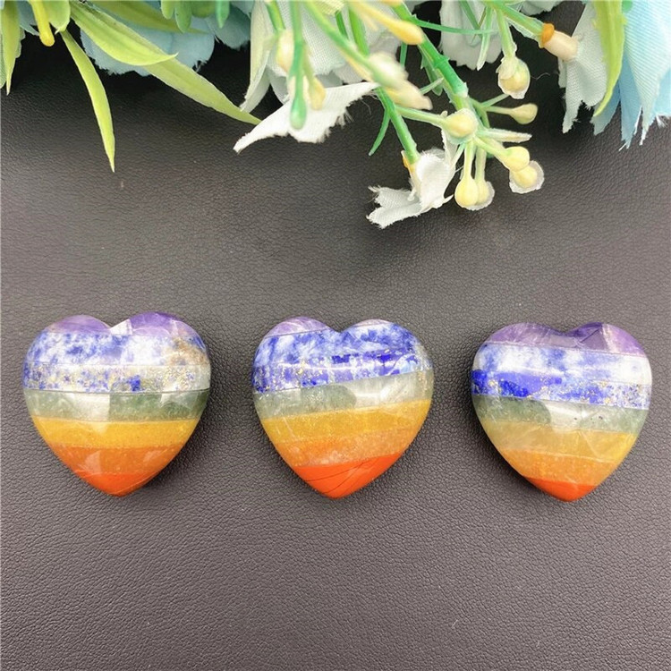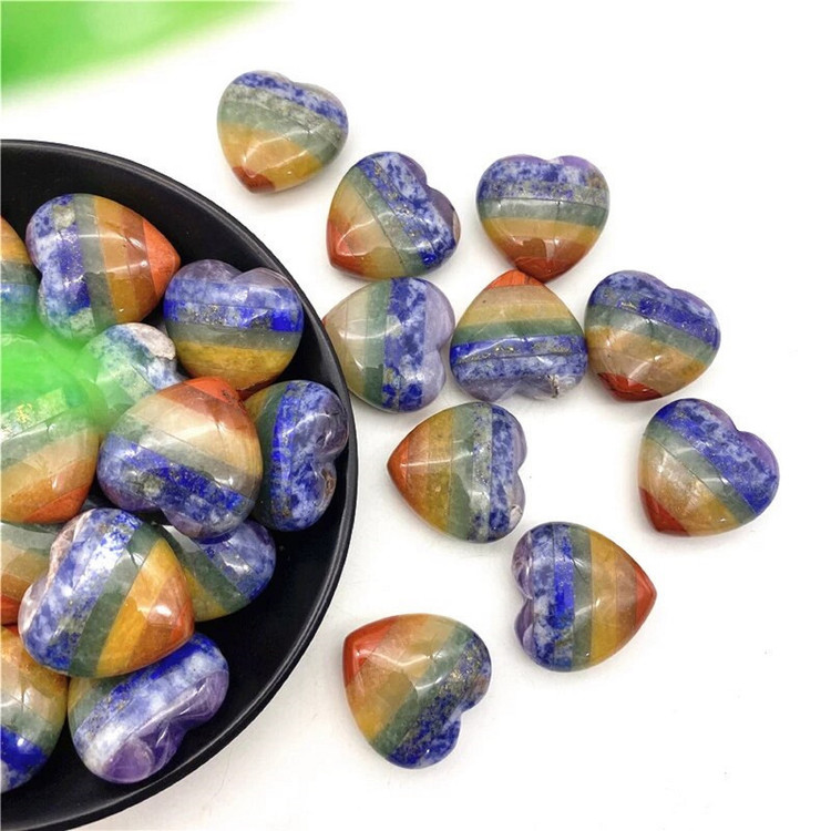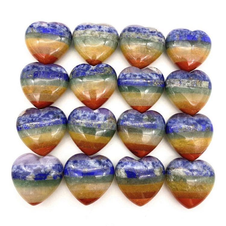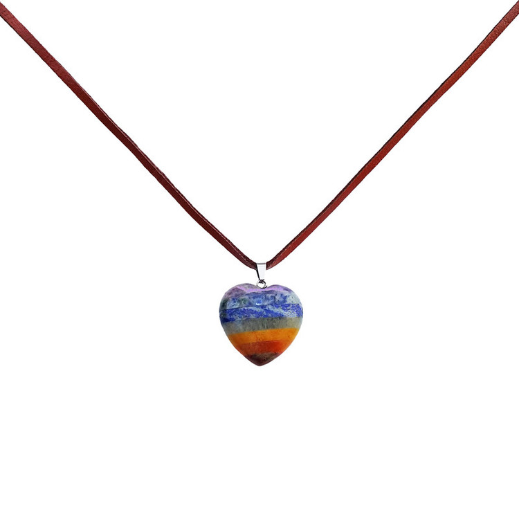 آویز قلبی سنگ هفت چاکرا، ساخته شده از هفت سنگ اصلی و قدرتمند که شامل آمیتیس، سودالیت، لاجورد، آونتورین سبز، آونتورین زرد، آونتورین نارنجی و جاسپر قرمز میباشد و همراه با یک بند چرم طبیعی ارائه میگردد