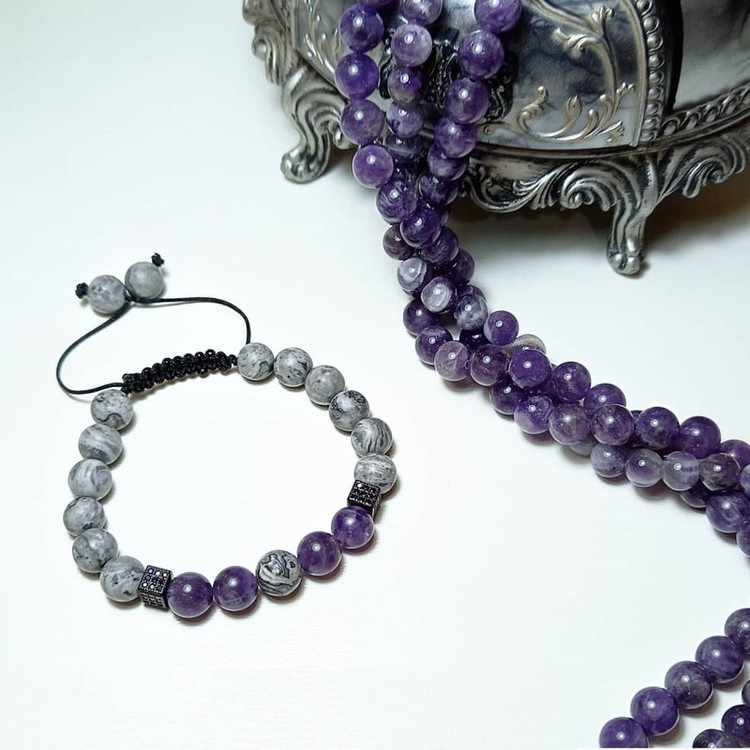 سنگ های استفاده شده سنگ جاسپر و آمیتیست سایز 8 می باشد. سوارسکی استفاده شده رنگ ثابت و نگین کاری شده است. انتهای کار گره کشویی و قابل تنظیم می باشد. از سایز مچ دست 15 تا22 سانتی متر قابل استفاده است.