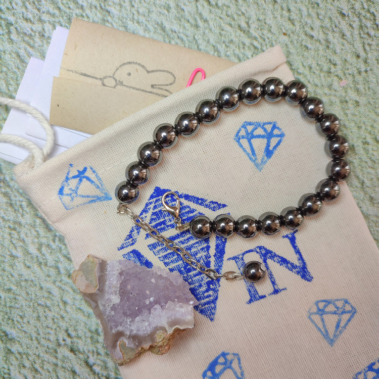 این دستبند ساخته شده از سنگ حدید طبیعی و معدنی میباشد که به همراه یک عدد بلور طبیعی سنگ آمیتیست ، کاتالوگ استفاده در بسته بندی کیسه الیاف طبیعی ارائه میشود