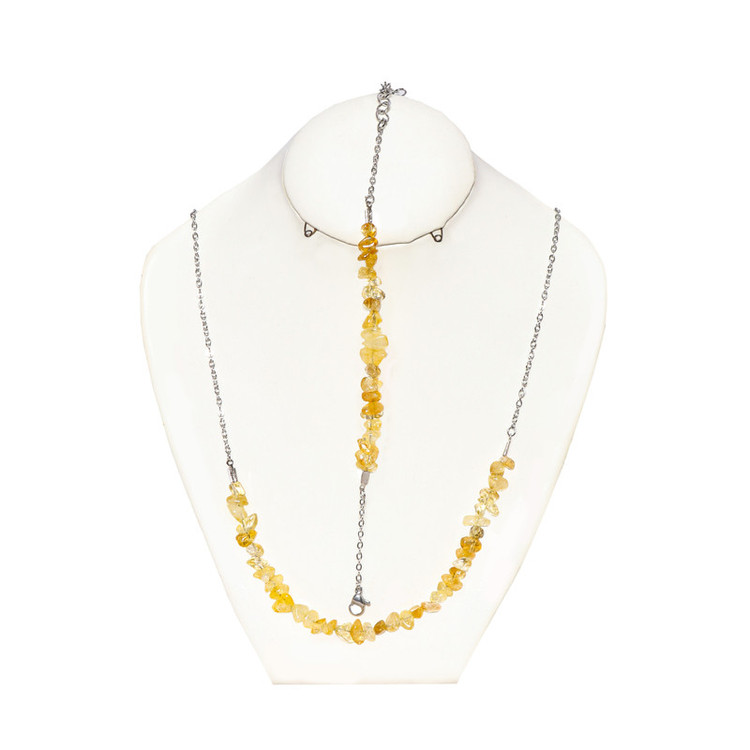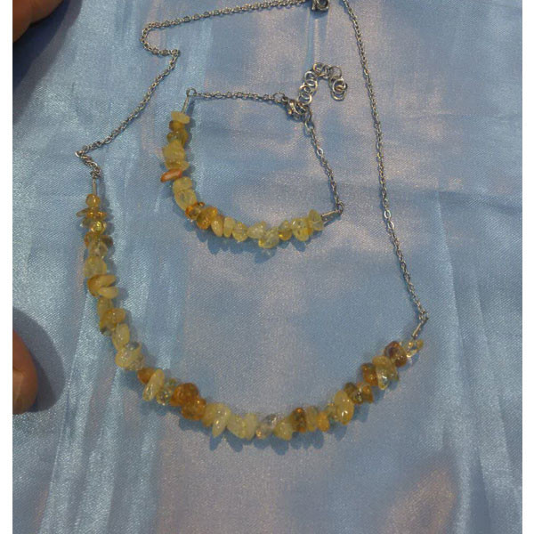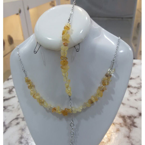 محصولی را که مشاهده می فرمایید نیم ست سنگ طبیعی سیترین می باشد.کاربرد این نیم ست زنانه بوده و برای رده های سنی نوجوانان ، جوانان و بزرگسالان قابل استفاده می باشد.جنس زنجیر و قفل به کار رفته استیل کاملا رنگ ثابت می باشد.از لحاظ خواص سنگ سیترین سنگ ثروت می باشد.به قلب انرژی می بخشد و باعث گرمی آن میشود. همچنین افسردگی و عصبانیت را درمان می کند و باعث تقویت اعتماد به نفس می شود.
