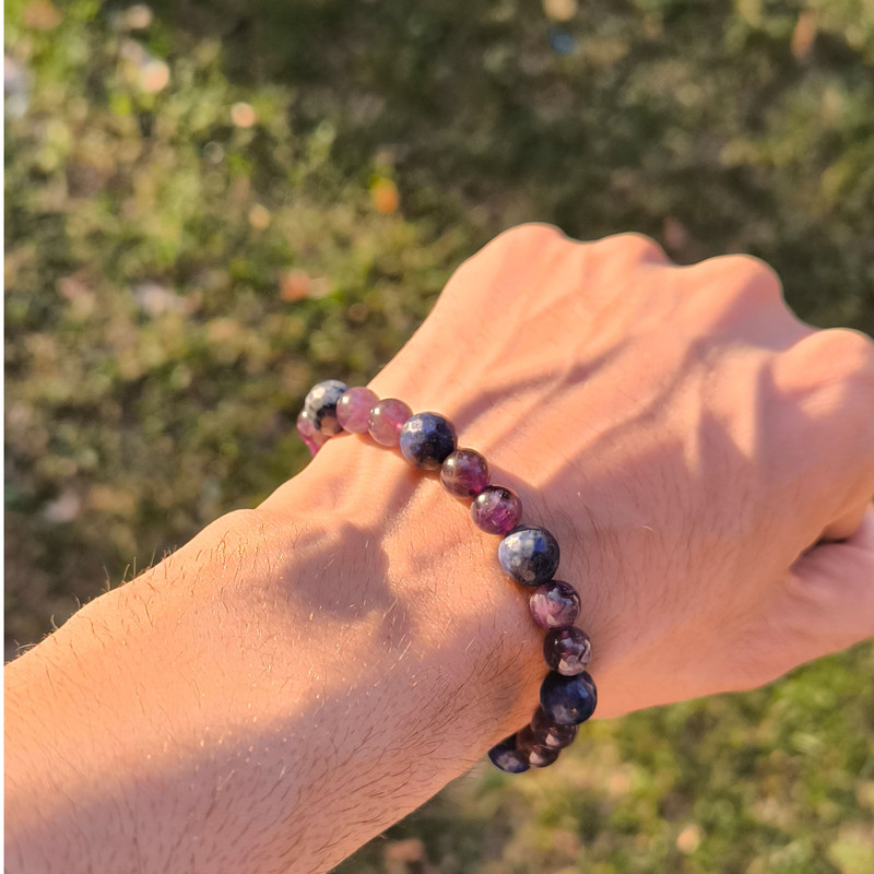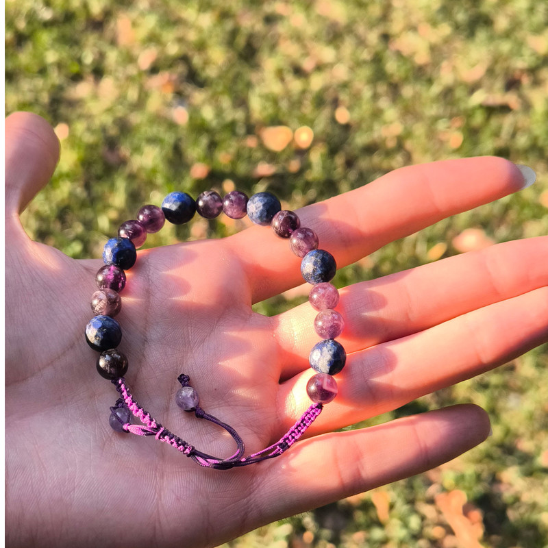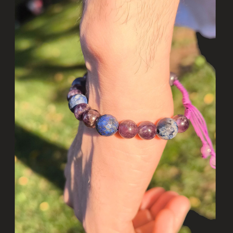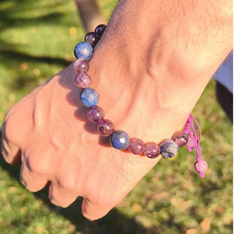 این دستبند با دقت و ظرافت بالا بافته شده و از سنگهای آمیتیست درجه یک و لاجورد افغانستان ساخته شده است. طراحی و ساخت آن به گونهای است که مقاومت و دوام بالایی داشته باشد، و انتخاب این سنگها نه تنها ظاهری شیک و زیبا به دستبند بخشیده، بلکه خواص انرژیبخش و آرامشبخش این سنگها را نیز به همراه دارد.