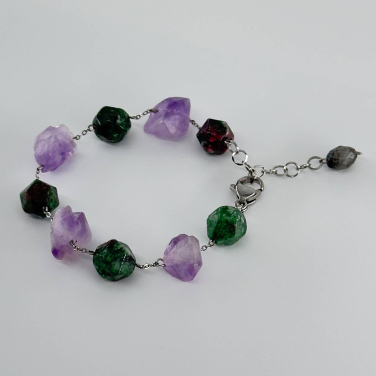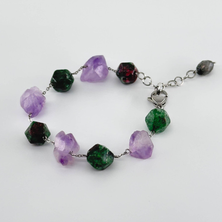 دستبند ترکیب سنگهای آمیتیست بلور و زئوسیت ( طبیعی ) متریال استیل ایتالیا ( رنگ ثابت و ضدحساسیت ) ( مدام استفاده شود ) قابلیت تنظیم سایز مچ دست نمونه انحصاری ( هنردست) دارای خواص درمانی فوق العاده ( انرژی درمانی )