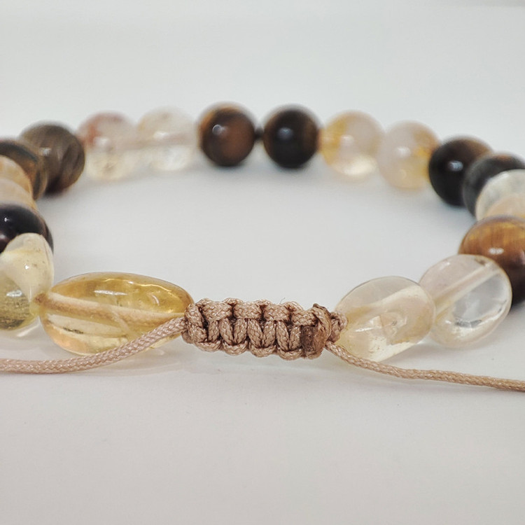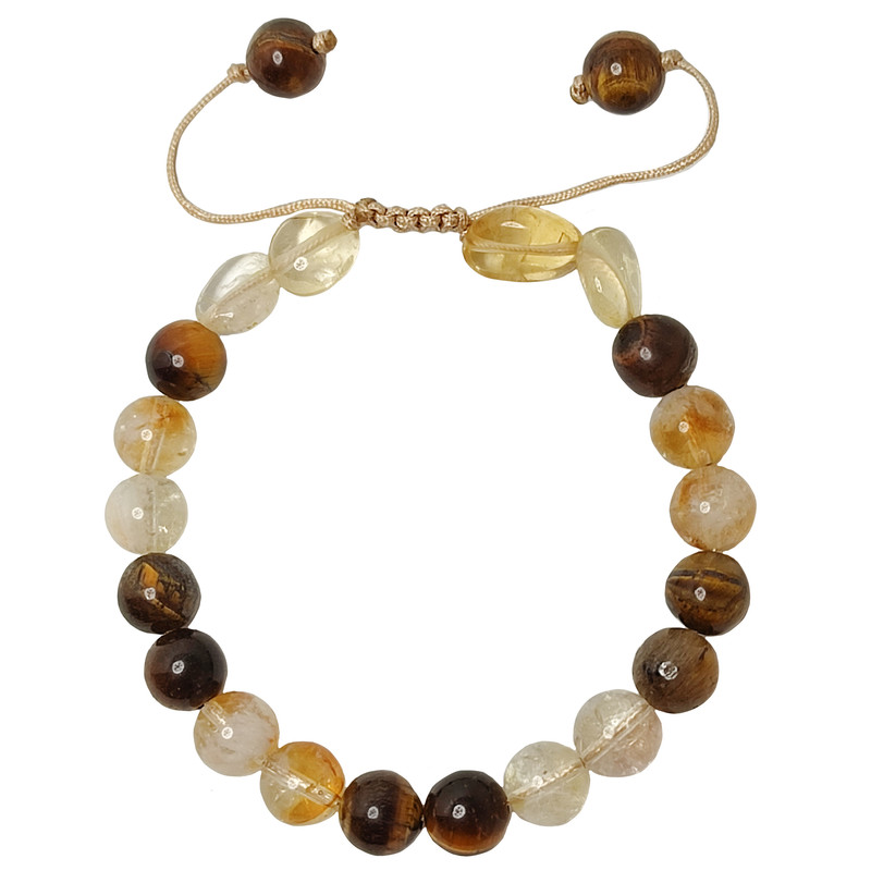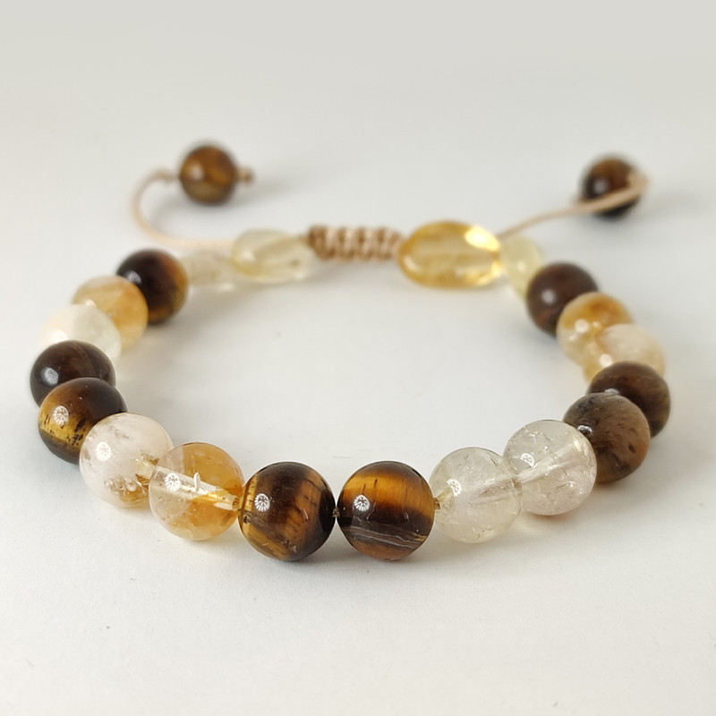 این دستبند ساخته شده از دو سنگ سیترین و چشم ببر میباشد که هر دو سنگ کاملا طبیعی و معدنی میباشد.همراه بسته بندی کیسه الیاف طبیعی یک عدد بلور طبیعی آمیتیست و یک کاتالوگ وجود دارد.