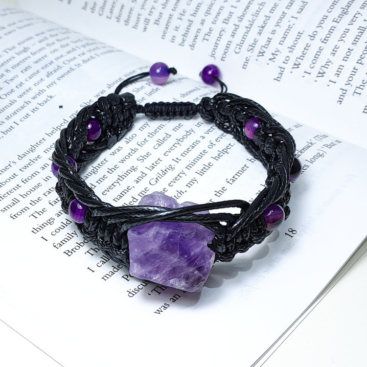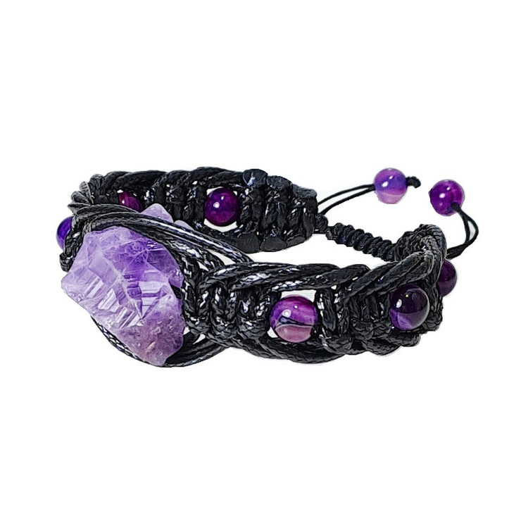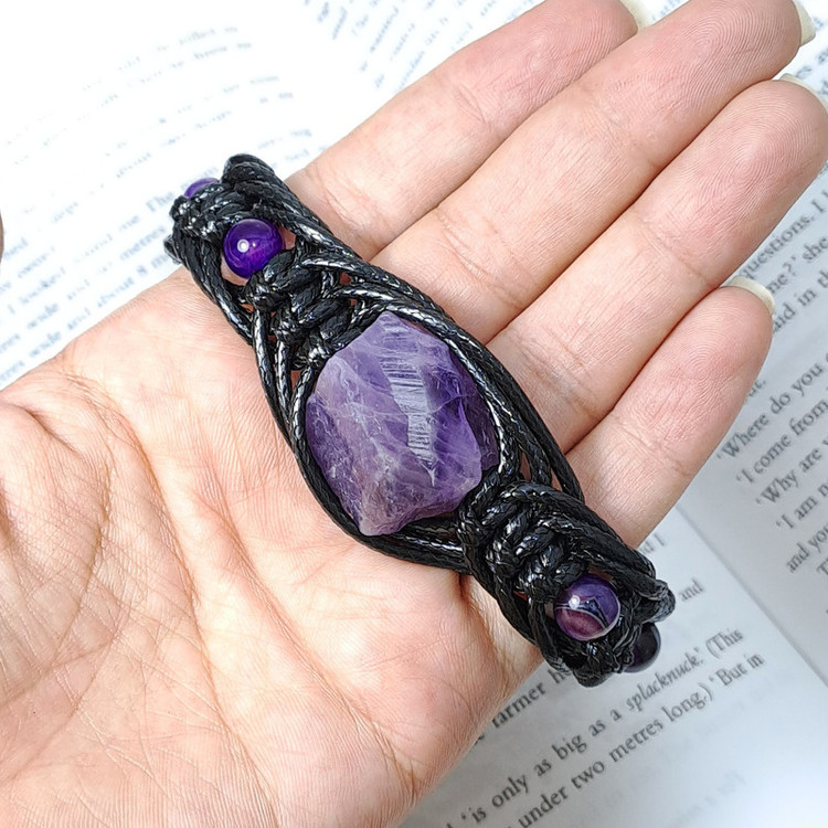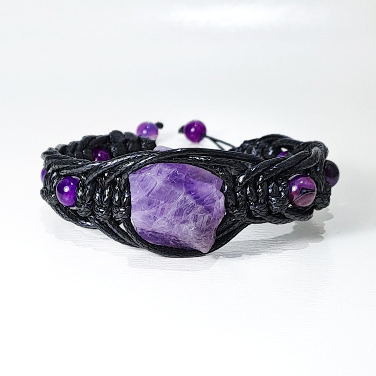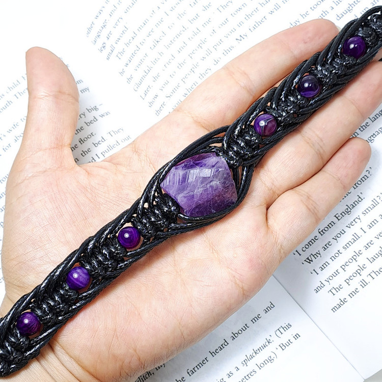 دستبند مردانه از راف آمیتیست حدود 15 گرم و سنگ های عقیق بهسازی رنگ شده سایز8 درست شده است. در این دستبند برای زیبایی بیشتر از چرم مصنوعی رنگ مشکی به صورت بافت تیغ ماهی استفاده شده است. این دستبند مناسب مچ دست سایز 19 تا 25 سانتی متر است.
