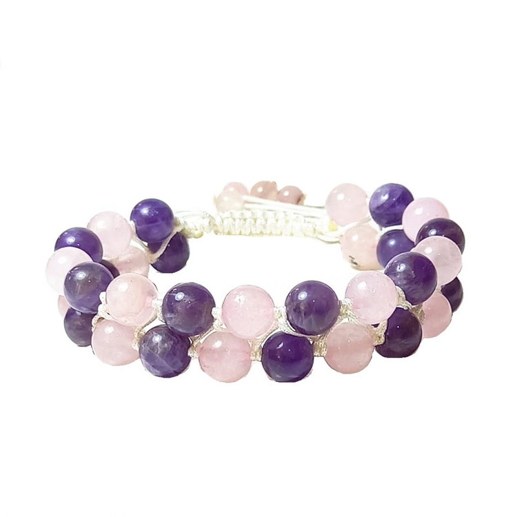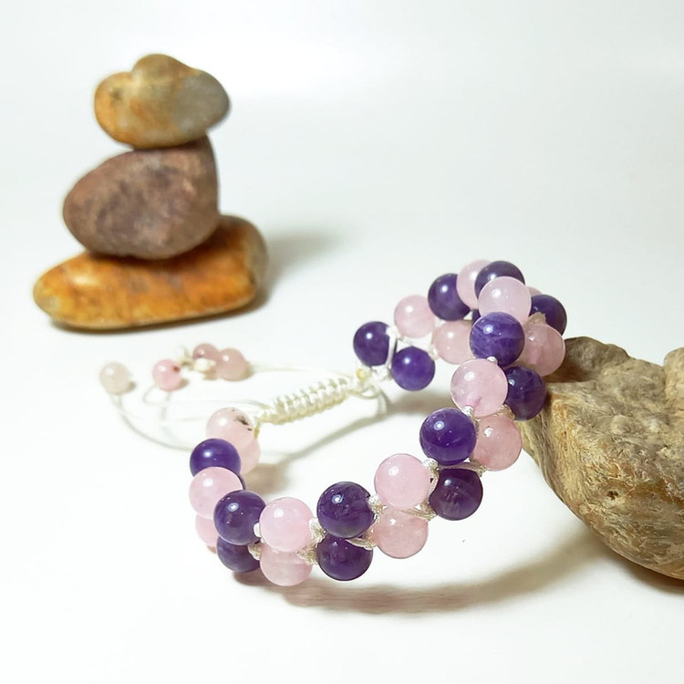 سنگ های استفاده شده در این کار آمیتیست و رزکوارتز سایز 8 می باشد. انتهای کار گره کشویی و قابل تنظیم است و مناسب برای سایز مچ دست 15 تا 22 سانتی متر می باشد.